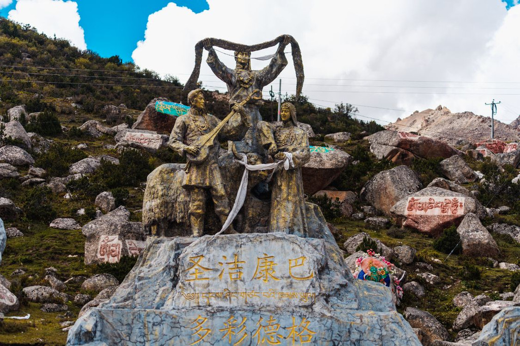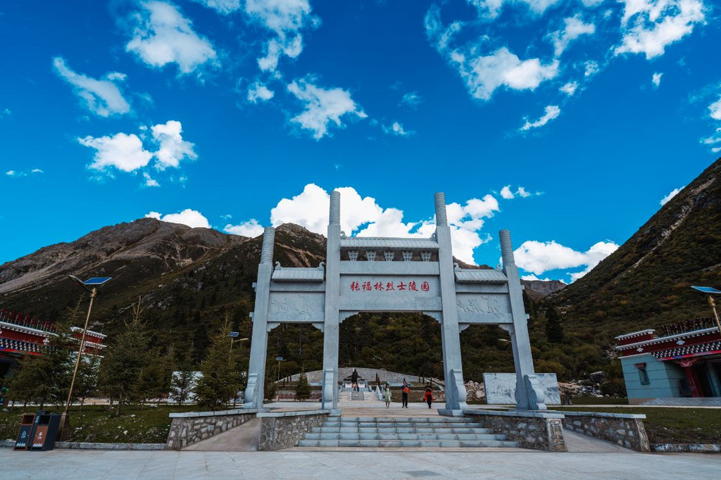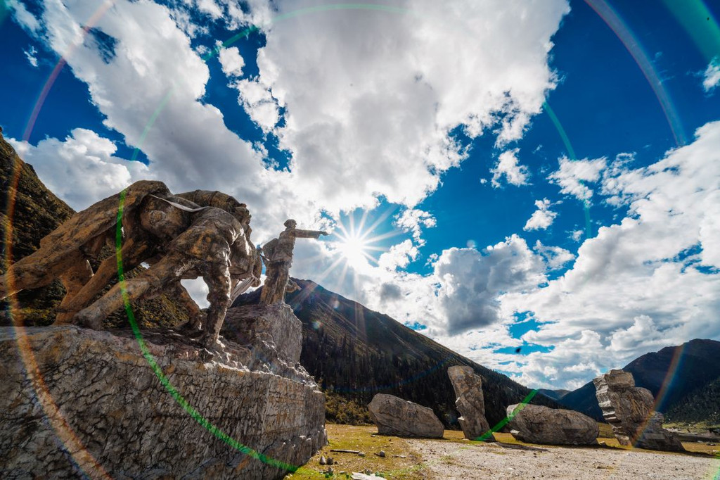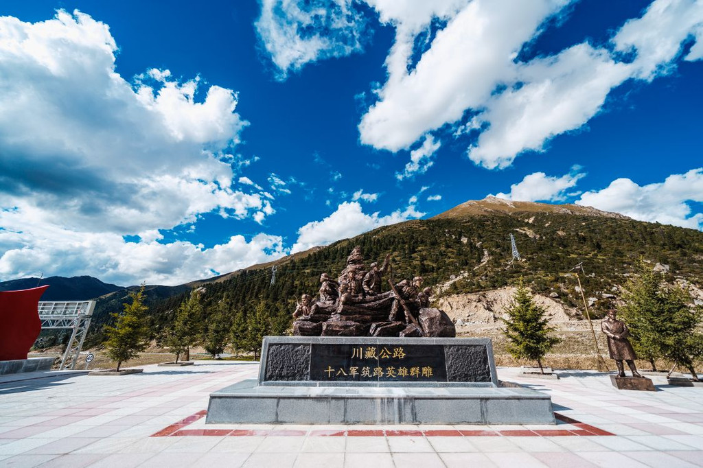 这一路关于十八军筑路的故事,处处流传,这天高云淡,解放西藏后在整个藏区“金珠玛米”就成了解放军的专有称呼,沿用至今。阳光照耀,白云缭绕,湛蓝苍穹之下英雄纪念碑更显伟岸神圣。 “十八军战士们豪迈而风趣地说,我们在雀儿山上,生活劳动在5000米的高度,睡觉是斜坡30度,开水是沸点70度,气温是寒暑表零下不够度,但我们的热血沸腾到了100度,智慧和力量没限度。”