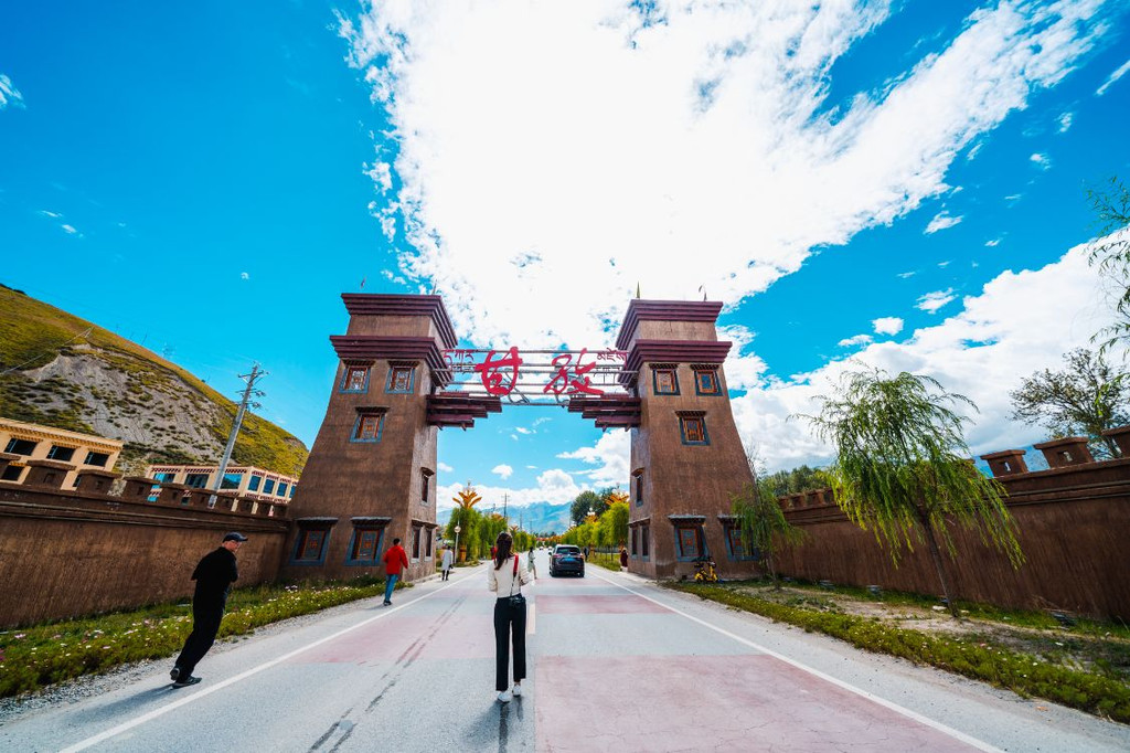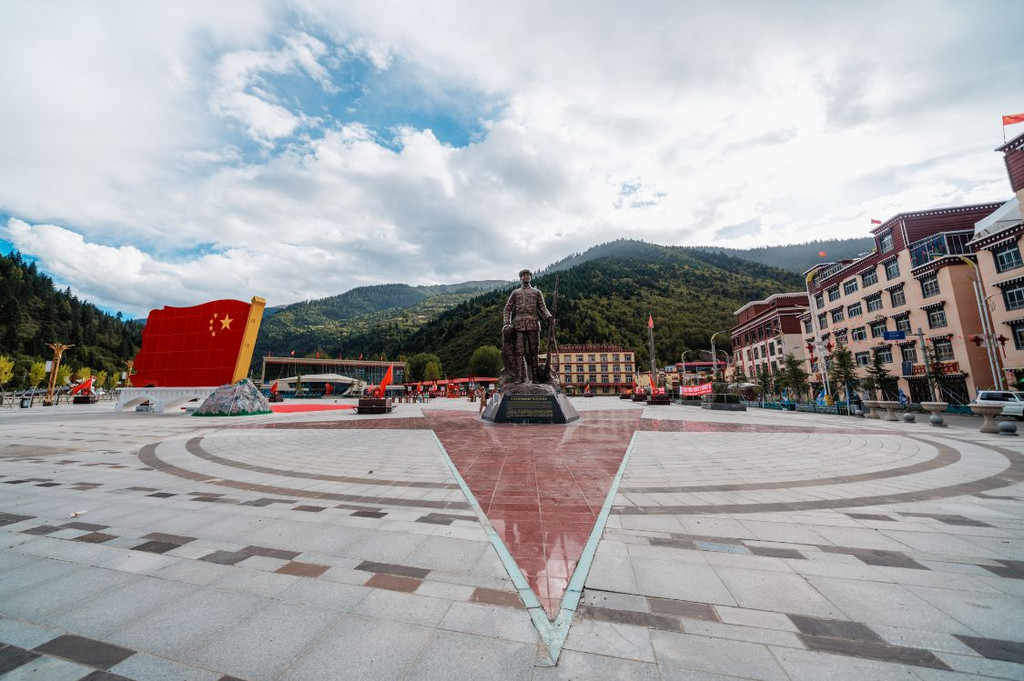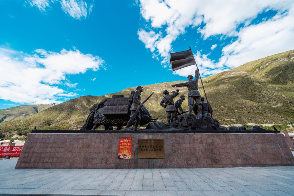 歌舞升平中,我们不能忘记这一路的美景,更不能忘记当年十八军走来的一路艰辛与牺牲。岗托,藏语意为"人口集中之地"。曾用名江卡松多。西藏和平解放前,属德格土司和噶厦地方政府管辖。西藏和平解放后,沿金沙江西岸属西藏自治区管辖,该地建成岗托区,东岸划归四川省管辖。因此,岗托也成为了西藏解放第一村。西藏第一面五星红旗也是在这里飘扬的。金沙江,是中国长江的上游。因江中沙土呈黄色得名。又名绳水、淹水、泸水。川藏界河。金沙江的水一望无际,向远处流淌,让我想起了《西游记》里的通天河,西天取经八十一难,而十八军进藏,这一路岂止八十一难?多少鲜活的生命就这样倒在了雪域高原之上。在藏语里,“岗”是渴的意思,“托”是饿的意思,昔日又“渴”又“饿”的岗托村今日变成了旅游村,更是见证西藏解放历史的村庄。下午,我们沿着当年十八军的走过的路,走进了岗托这个极具色彩的村庄,如今的村庄依旧宁静祥和。1950年仲秋,中国人民解放军第十八军扫清了进军西藏道路上的反动势力,胜利强渡金沙江,五星红旗迎着金色的晨光在这里飘扬,而这些是无数坚难困苦换来的。徒步走进金沙江畔的岗托村,流水潺潺,偶有几头牛悠闲走过来。一座座藏式独栋房子,带着藏族特有的色彩,白云悠悠,这天地间祥和而美丽。眼前的雕像让人不禁思忆曾经。从岗托村回来,重回红旗广场,远山含黛,白云悠悠,红旗飘扬,这一切的美丽映入眼底心间。