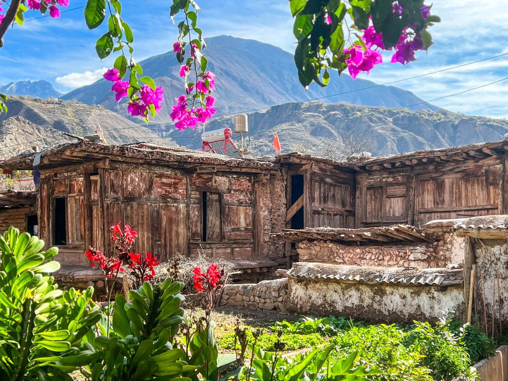 在这一组图中,我们可以清楚地看到,远处是巍峨的雪山,中景是拥有三百多年历史的藏族古民居,近景则是郁郁葱葱的菜园子,边上还种有鲜花和三角梅,而且开得正艳。
