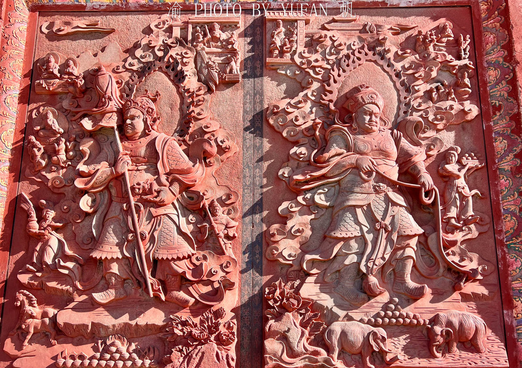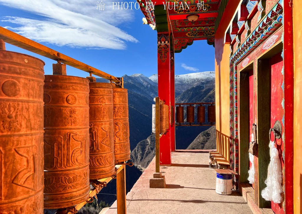 德钦日追寺最大的建筑特点是融合了汉藏风格,在这里我们不仅看到了藏传寺院少见的龙柱,甚至在一间大殿前还有中原宫殿式建筑前常见的龙纹,这无疑是民族文化融合发展的具体体现。