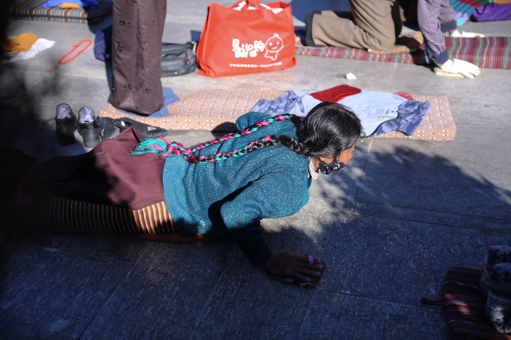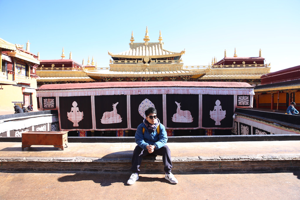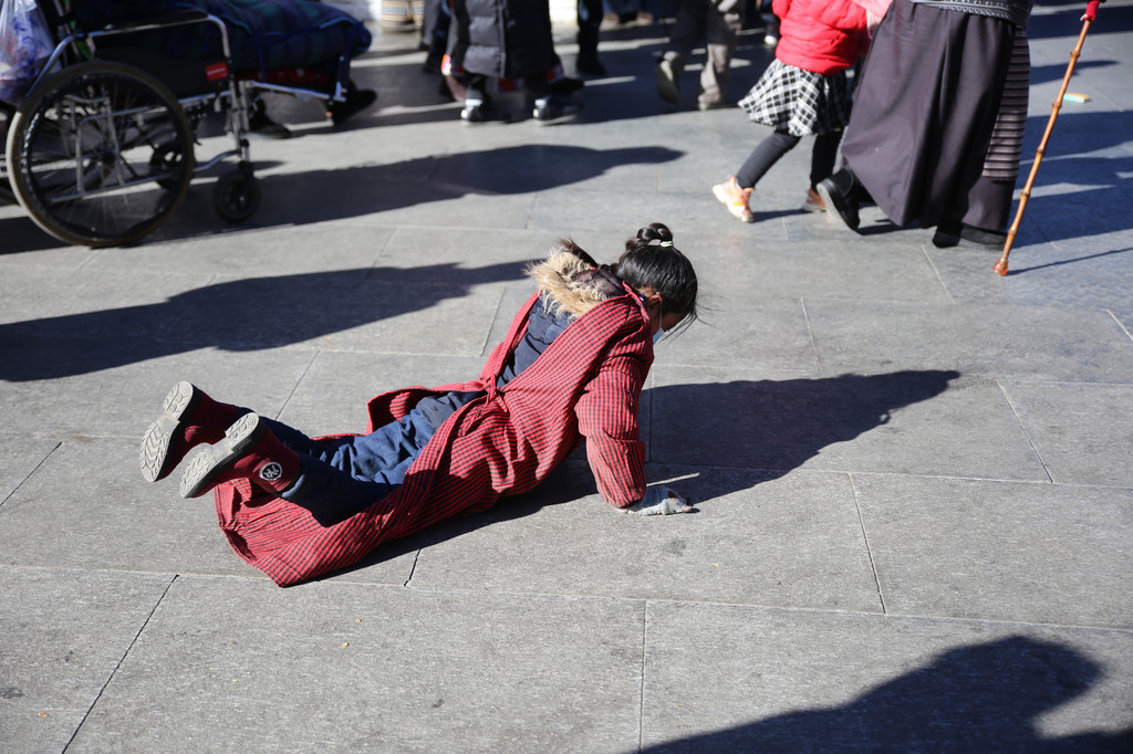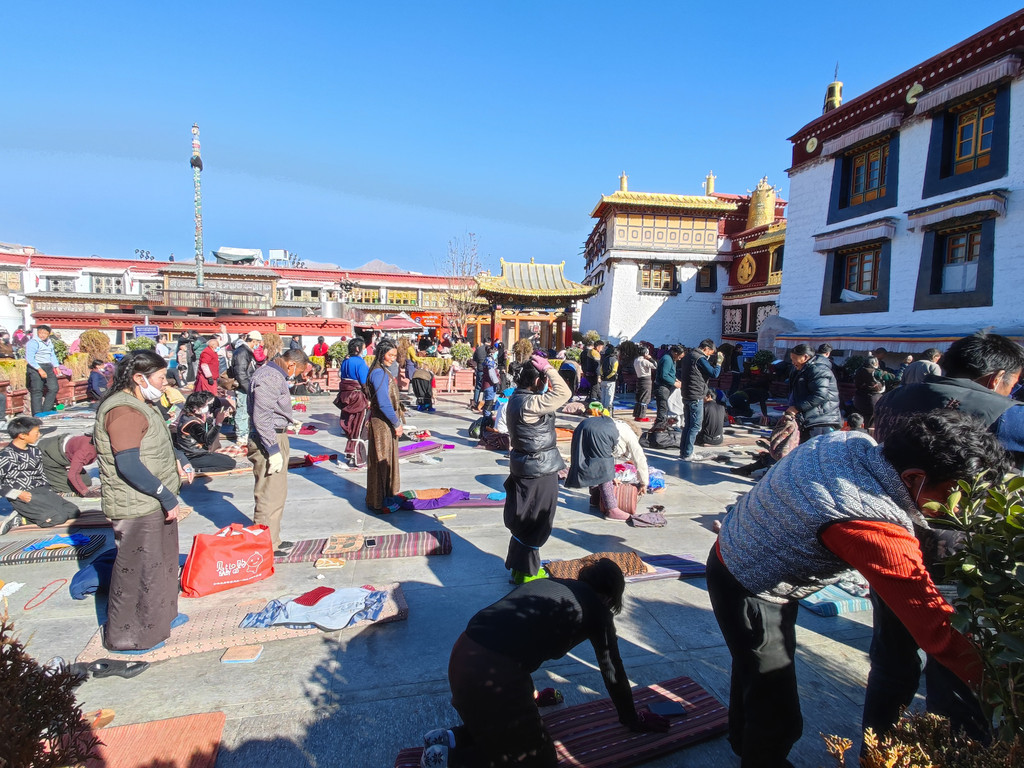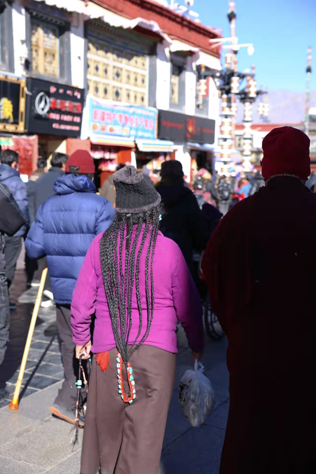 2号 睡个懒觉起来后吃点东西,去逛大昭寺,也是提前预约好了中午的时间(12点开始是第一批),大昭寺上午的时间是不能约的,因为时间是留给信徒朝拜的,大昭寺的门口有很多藏民在磕头的,非常的虔诚,据说头磕的越多越多,虽然不理解但是要尊重。 大昭寺的广场上还有转寺的人,我们也跟着大部队围着大昭寺转上了一圈,然后找了个街边的座位坐在那儿看来来往往的人,俗称发呆墙,太阳很好,人很多,可以在发呆墙懒懒的带上一天。
