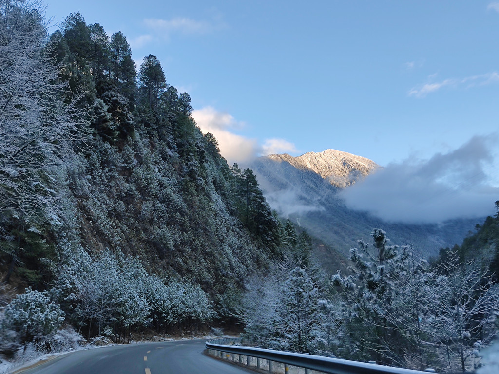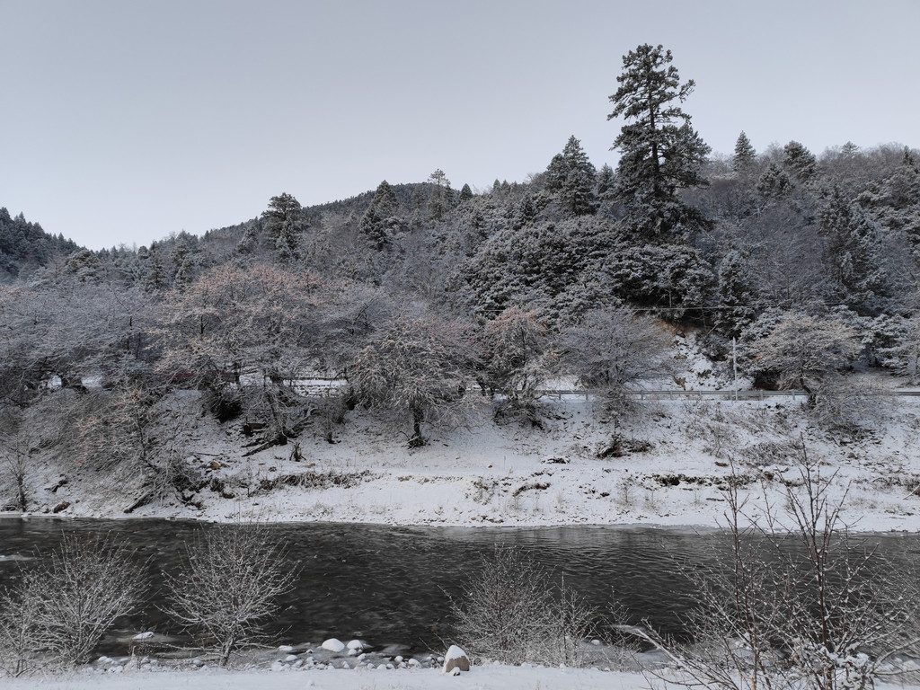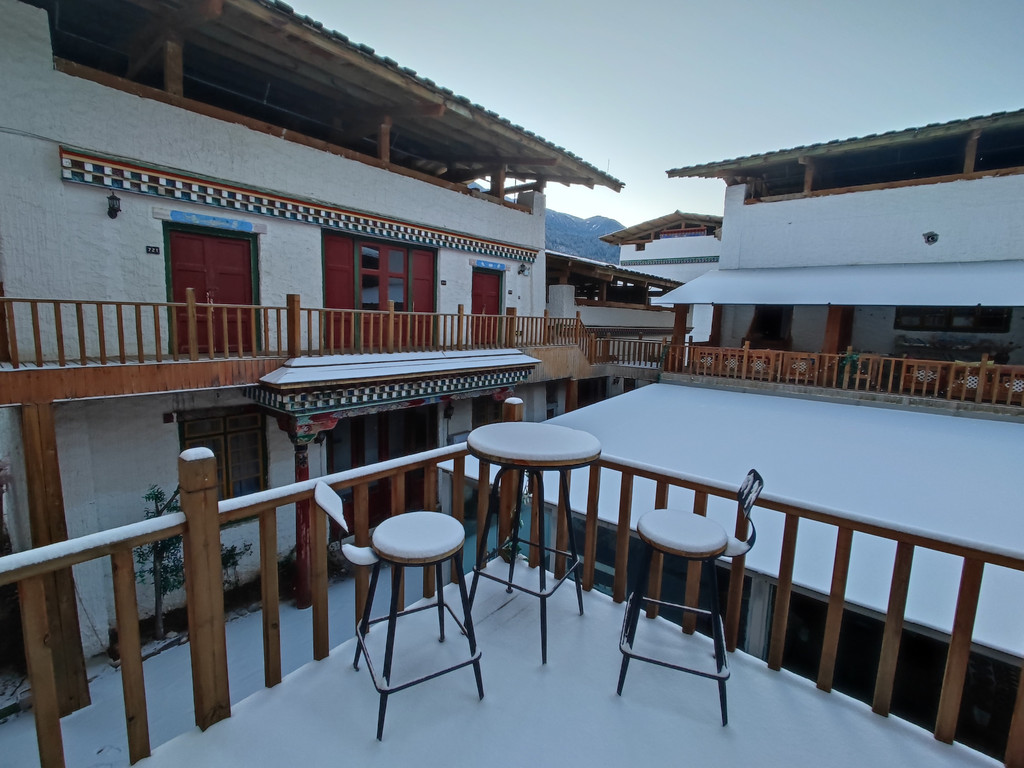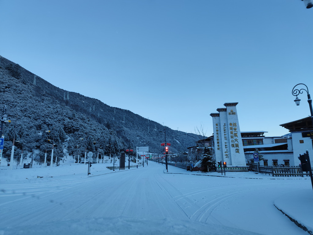 4号(鲁朗到然乌湖), 早上起来屋外一片白茫茫的,大概下了一夜的雪吧,民宿门口的凳子上积了厚厚的一层,出发经过镇子,整个镇子被白雪覆盖,还是挺美的,因为比较冻手,带的无人机就没有拿出来,就手机简单记录了下。