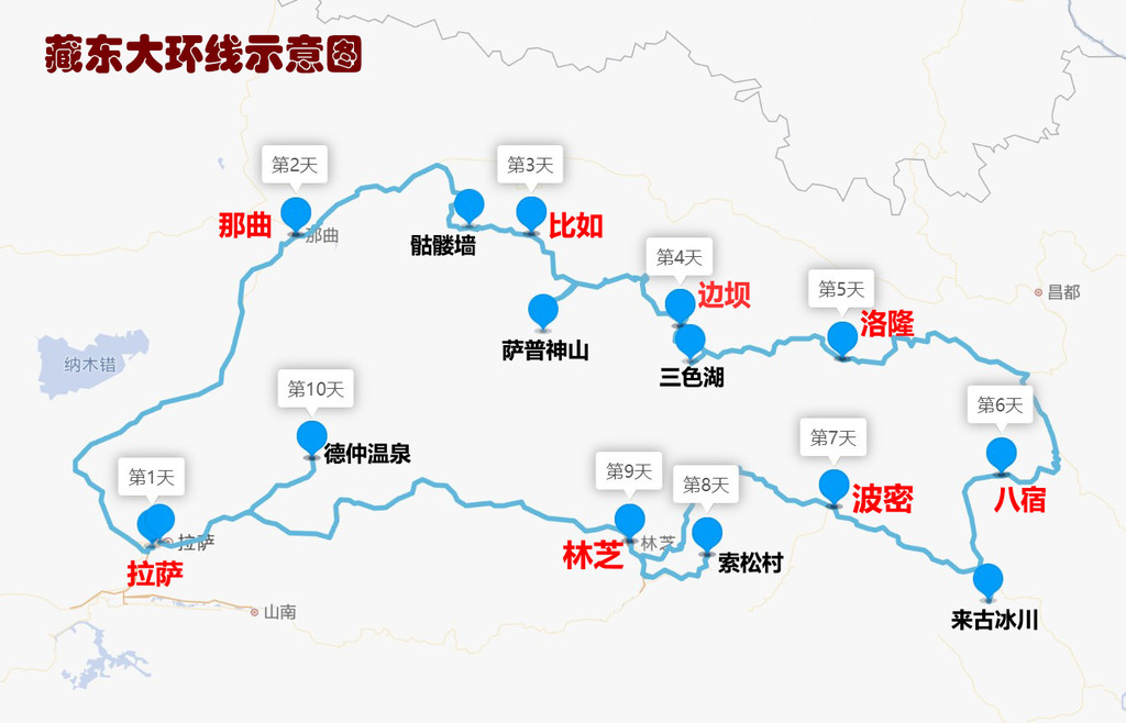 拉萨出发,途径那曲、比如、边坝、洛隆、八宿、波密、林芝,最后返回拉萨,建议时长为10天9晚,绝大多数路段为铺装路面,路况良好,一辆轿车就可搞定。