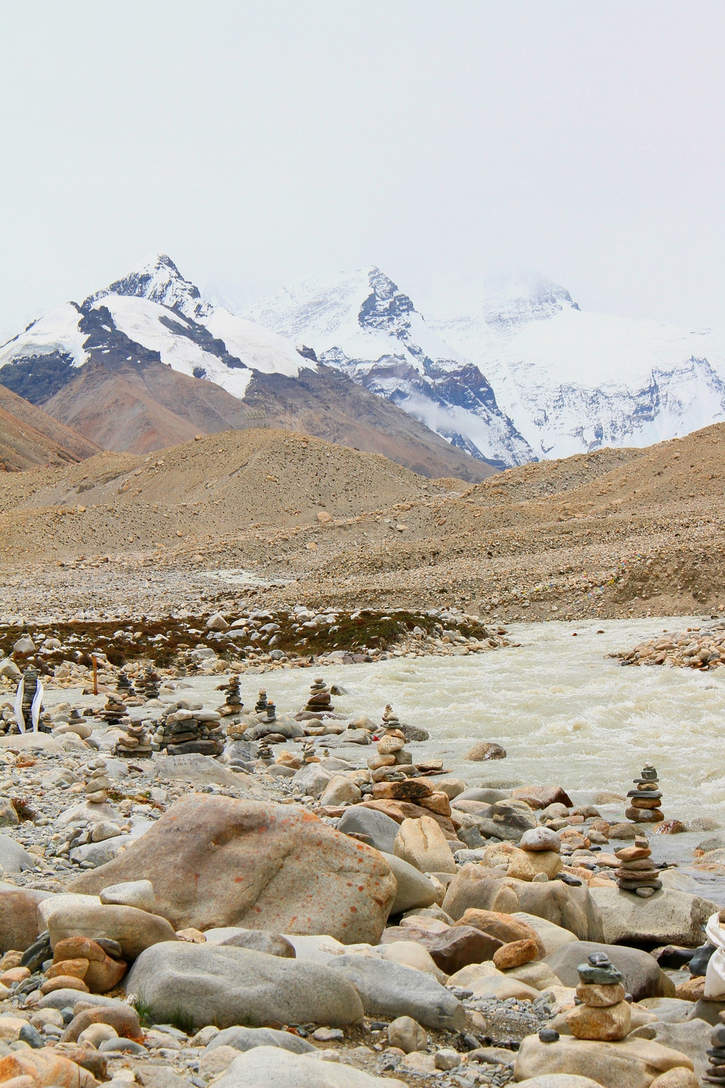 快到珠峰大本营了,在世界海拔最高的寺院绒布寺山脚下的边防武警哨卡,又一次检查了身份证和边防证等,之后,我们终于把汽车开进了海拔5200米的珠峰大本营。这是多么激动人心的时刻啊!经历千辛万苦、克服重重困难来到珠峰跟前,真的太不简单、太不容易了。喜悦、兴奋、自豪之情挂在每个人的脸上。虽说这里是每个热爱旅行的人一生中最向往的地方,但由于诸多因素的制约,以前是连做梦都不敢想的事,现在不仅居然真的来到了这里,还能切身体验以前只有在影视中和媒体上才能见到的场景情景。激动之情,难以言表。虽然天气状况只是一般般,对景观造成很大的影响,但映入眼帘的一切仍然是非常震撼人心的。