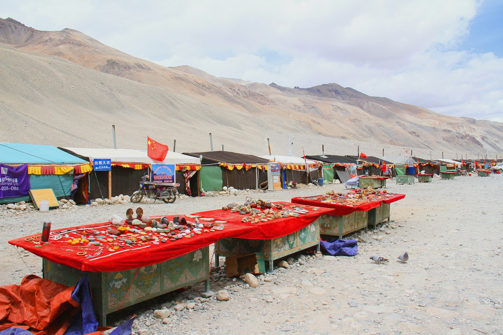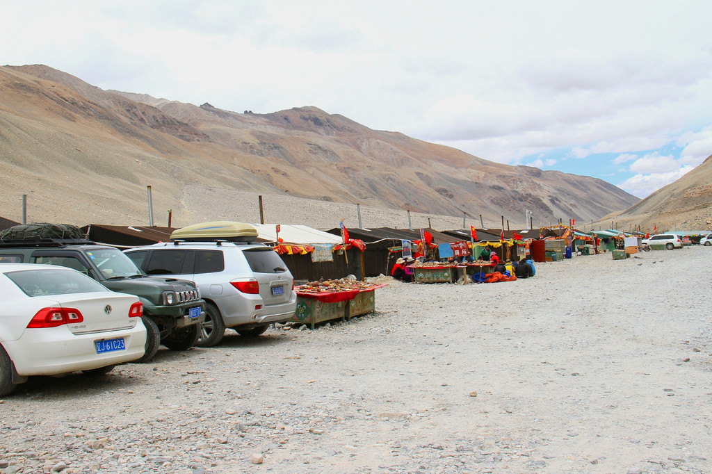 从珠峰大本营海拔5200米纪念碑再往前走一段路,才能到达珠穆朗玛峰高程测量纪念碑,这是游客能到达距离珠峰最近的地方了,据说再往前走需持进山证的人士才会被允许。虽然距离不算很远,但在这样高海拔的地方行走还是有点累的。我们慢慢地走了过去,好在风不是很大(这里经常刮大风)、气温也不是很低(约5、6度吧),并没有感觉到很冷。在珠穆朗玛峰高程测量纪念碑这里又拍了拍照,还眺望了同样是一般游客不容易观赏到的绒布冰川(曾被《中国国家地理》评为中国最美的六大冰川之首),然后才慢慢往回走,来到大本营这边,逛一逛由藏民自建的帐篷旅店、卖土特产的小摊和世界海拔最高的珠峰邮局。就是在这样一个没有一点绿色、空气稀薄、几近原始的地方,才最能深深地感受大自然的伟大和人的渺小。我们前后在珠峰大本营逗留了两个多小时。