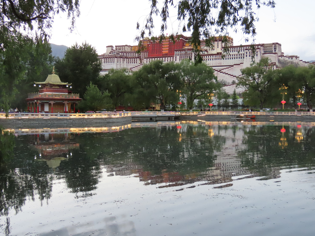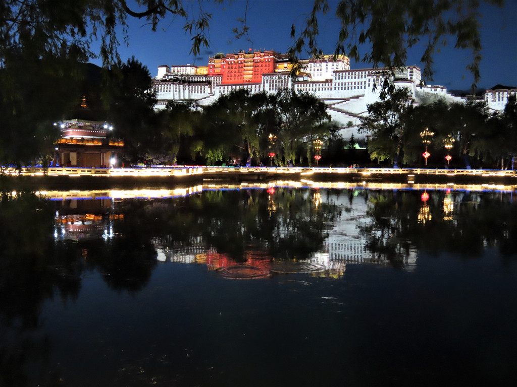 打个车去广场看看夜景吧,哪的风光一定不错,金色的夕阳洒满大地,绿树鲜花 湖水亭阁以及红山上的布达拉宫都披上了一层金沙,就连一闪一闪的波光都是金色的,真应了那句“夕阳无限好”的诗词。紧接着就是华灯齐放灯火阑珊,整个布宫广场更加炫彩美丽,广场上高高的白色和平解放纪念碑,两列红色灯笼就象它伸出的双臂去拥抱前方的布达拉宫,大型音乐喷泉时而不停扭动腰身时尔奋力向上喷洒着水柱好象跳着欢快的舞蹈,对面的布达拉宫白白的宫墙红艳艳的宫殿就象身穿盛服的老人坐在红山上望向这边欢乐的海洋。布达拉宫广场的夜晚真是醉人的地方,让人流连忘返。