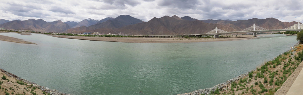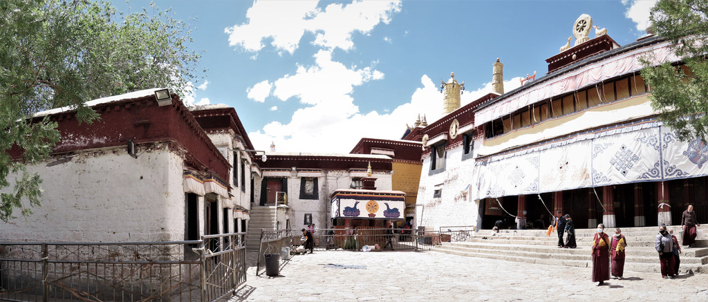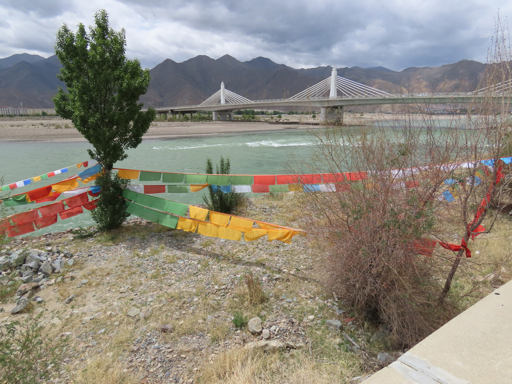 但是,这儿的高反还是厉害的,夫人就中招了。第二天她在家吸氧气调养,我自己个儿遛酒店后面的拉萨河去。河水上游是一片湿地,那是水鸟们喜欢的地方。一望无际的拉萨河水不是绿的也不是蓝的它是白色的,清澈透明,摆明了就是高山雪水汇成的,湍流奔涌涛涛不绝。周围看不见人影,沿岸拉起的经幡在风中哗啦啦飘着,衬着远处的大桥和时而滚过的车声,太静逸了。第三天该是团友们参团集合的时间,我们调整好了去色拉寺看看,哪儿的喇嘛辩经很有特色。正赶上这个月是喇嘛的什么节日,朝拜转经的人真多。辩经场有两个,右边的是初级班,是学习辨经的地方。对面院子才是正经辨经的场所。