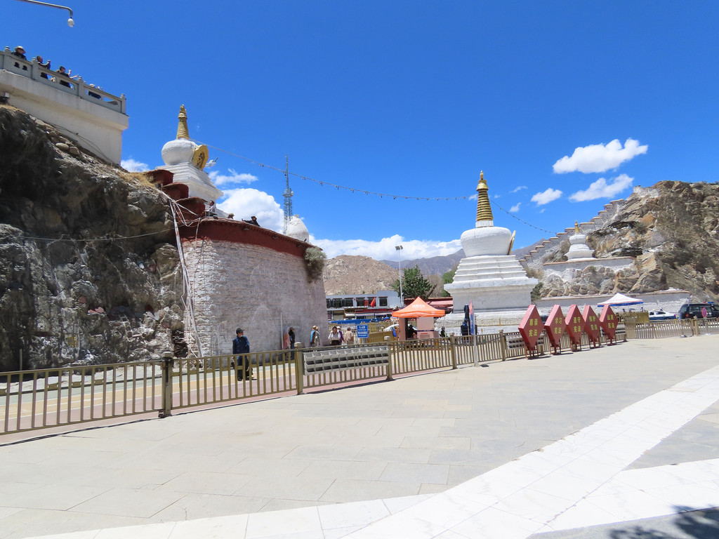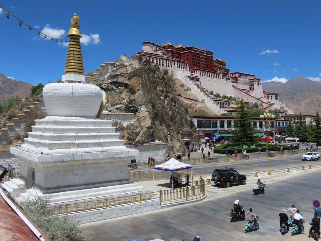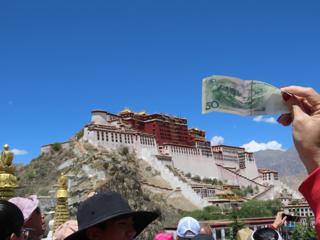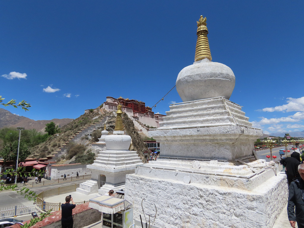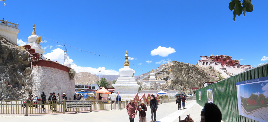 从布宫平台往下看有个园林非常漂亮,有机会一定去看看;布宫对面是和平广场,那个纪念碑太显眼了,到那面去吧。穿过地道就是广场,广场东面也是一个园林,楼台亭阁小桥流水、大树参天绿草茵茵、蝴蝶翠鸟鲜花锦簇,衬着头上的蓝天白云、对面的青山布宫、水中的倒影,好似天上人间的仙境,这儿真是观赏布达拉宫全景的好地方。广场上还特意安装好几处小镜子,很多人围在哪摆出各种姿势照布达拉宫的倒影。从这儿再向前是药王山,那儿不仅是欢赏布达拉宫的好地方,更是五十元人民币图案的取景地,有心人会拿着五十元人民币跟布宫来个对接的艺术照。几座白塔把药王山跟布达拉宫连在一起,这儿,就是拉萨城的龙脉。