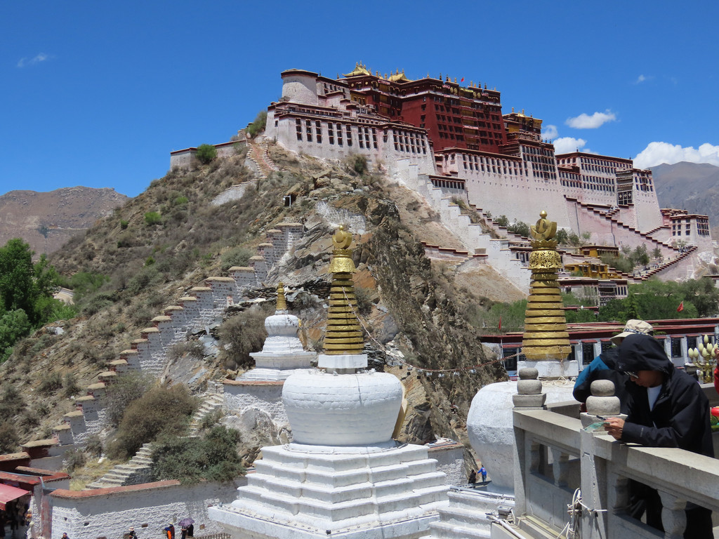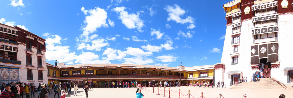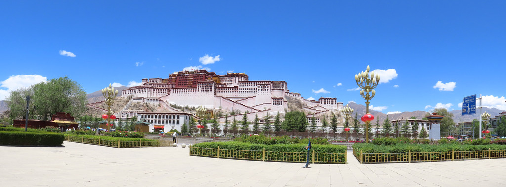 到拉萨第四天是正式开团的日子,今个儿随团参观布达拉宫。拉萨市中心的玛布日山也就是红山上站着的就是布达拉宫,有说是松赞干布为迎娶文成公主建的,有说是为迁都拉萨修建的,好象人们更喜欢是为文成公主修建的,这样更能显示大唐也就是我们大汉族的威风势。艳阳照着蓝天白云,广场铺着草坪绿树,草坪上盛开着鲜花,它们都围绕着玛布日山簇拥着布达拉宫,这儿是藏族人们心中的圣地仙山。布宫广场上还有造币厂,监狱,土司官衙和土司住宅等等可以参观。藏式建筑最底层永远是给性畜和奴隶住的,级别越高住的也越高,所以达赖一定是住在布达拉宫最高处,高处是离天堂更近的地方。上布宫的步道是用大条石铺的,很长很陡,很多人是拿着氧气罐边圾边歇上来的,然而布宫里面的楼梯更陡,甚至需要四手并用往上爬,好象爬炮楼似的,上布宫可真是个体力活。布宫的宝物自然很多,大多集中在经书佛像等等,可供参观的走道空间太狭窄,能供俩人并排的地方就算宽敞了。在红宫里看见当年陈毅和达赖和平谈判的地方,好象半间厨房大小的地方摆着只能挤着坐的二人沙发,是是太憋屈了。这地方除了神圣庄严住着可真不舒服。