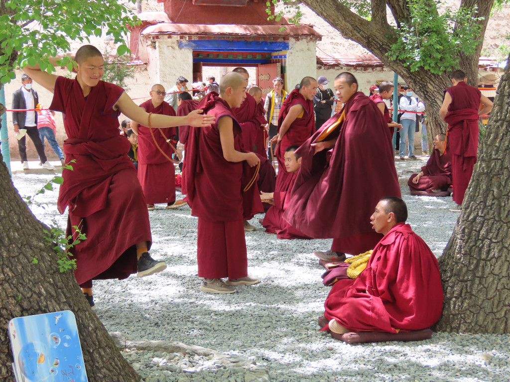 出家人辨经论法修练提升自己造诣的事儿听说过可没见过,也从没想过还能亲眼看看,色拉寺就能弥补这方面的缺憾。色拉寺盖了有好几百年,当初高僧们在一处鲜花盛开的地方定址开建,这种花儿藏语发音是“色拉”,其实就是蔷薇花,为了纪念这美好的地方寺名就叫色拉寺;但是同样的藏语发音还有别的意思,相传建寺的第一天正赶上下冰雹,雹子的藏语也是“色拉”,色拉寺的汉语意思就成了“冰雹寺”,我还是喜欢第一个美丽传说“色拉寺”,而寺院全称是“色拉大乘寺”。辨经每天下午都有,这是喇嘛们提高造诣甚至晋升更高职位的一种方式。他们俩俩相对有问有答,问的扬手投足前进后退甚而大力击掌用以加强气势,答的正襟盘坐气定神闲一副胸有成竹无所不知的样子,不仅看着过瘾还很有意思。