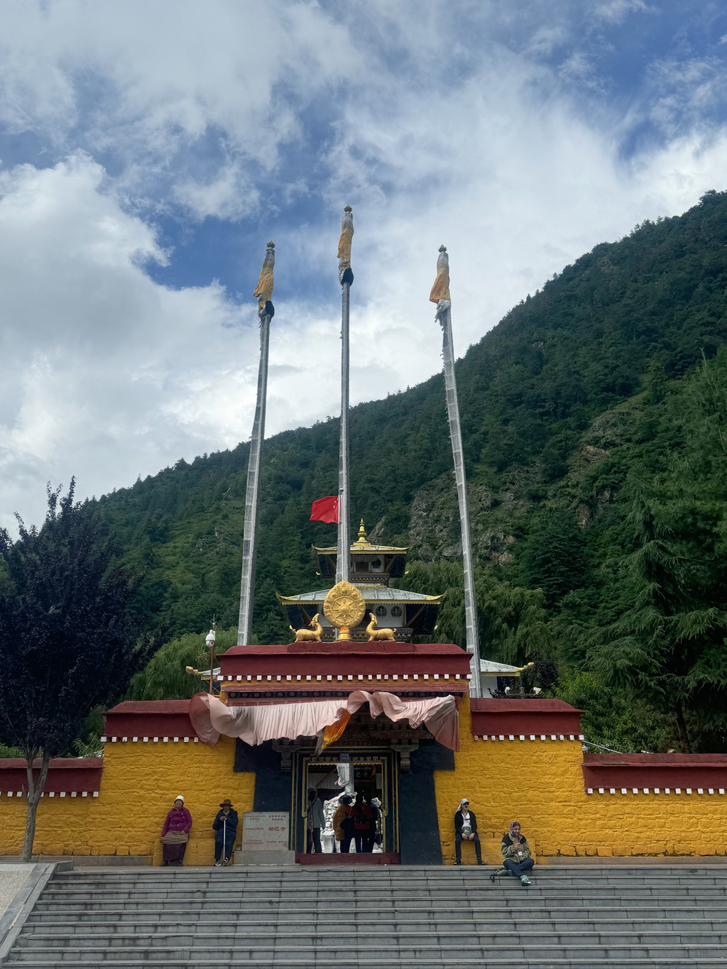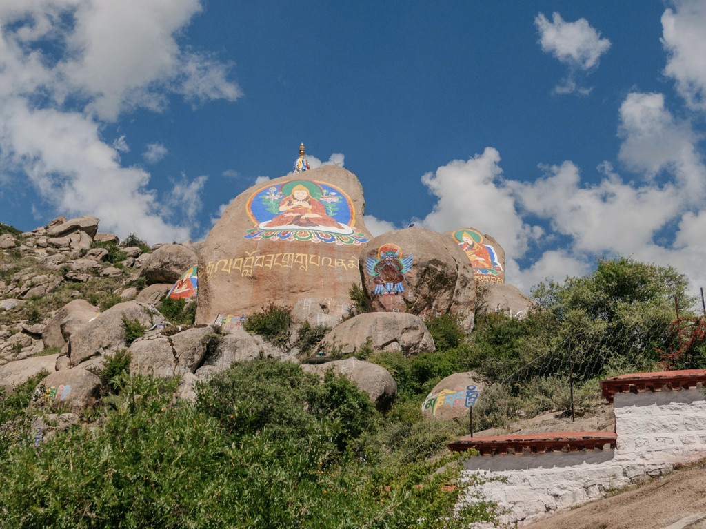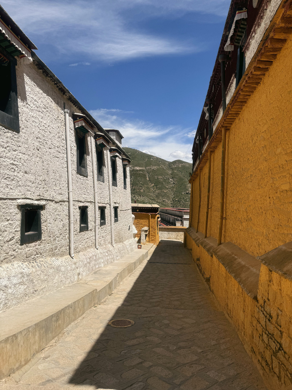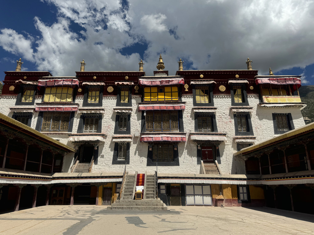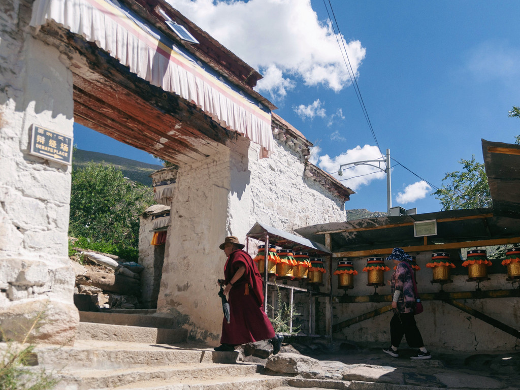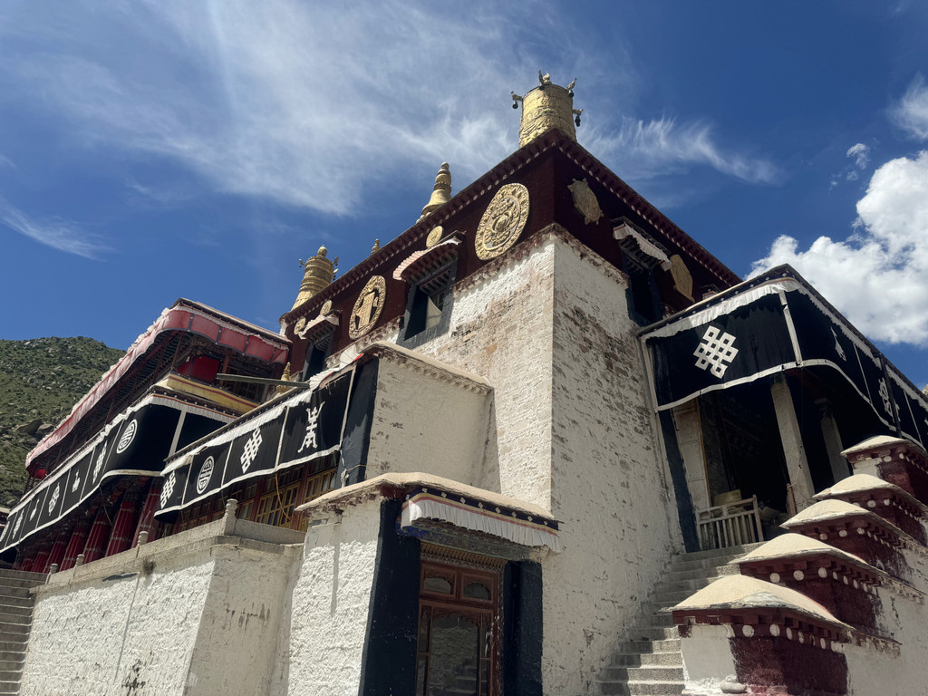 顺着台阶缓步而上,转经筒和辩经场陆续呈现,白塔、佛像在半山坡、在拐角处均有设置,令人感觉很快进入了佛界空间,一路喘气登上几十级台阶后,甘丹颇章的庭院透过不起眼的门洞已可看见,政教合一的兴发之地简朴明净,对推动西藏历史进程的影响力巨大。经过又一轮台阶攀登,宽阔的措钦大殿就在眼前了,殿外广场两边各矗立着经幡柱,站立广场上可俯瞰拉萨城,山间白云与大殿成平视角度,凡人身处其中显得渺小卑微,对天、地、佛的敬畏之心油然而生……措钦大殿的规模之大果然名不虚传,可同时容纳过千僧侣礼佛诵经的场面十分震撼,哲蚌寺是藏区第一大寺的名号得以验证,随后参拜的密宗院、大威德金刚更是彰显了哲蚌寺尊贵的宗教地位,三大寺之首实至名归、不妨多让!沿着下山之路蜿蜒盘旋,诸多扎仓建筑令人目不暇接,这里的扎仓实为学院,是僧侣进修学习佛法的场所,是藏传佛教远近传播的学府式圣地,寺中的罗赛林扎仓规模最大,经堂和佛殿里的经文藏品极为丰富珍贵……将近6小时的参拜浏览,也就算是对哲蚌寺粗略皮毛的一般认知,对其影响力有了初步印象,如有机会一定要再次拜访,十分值得且十分难忘,扎西德勒!