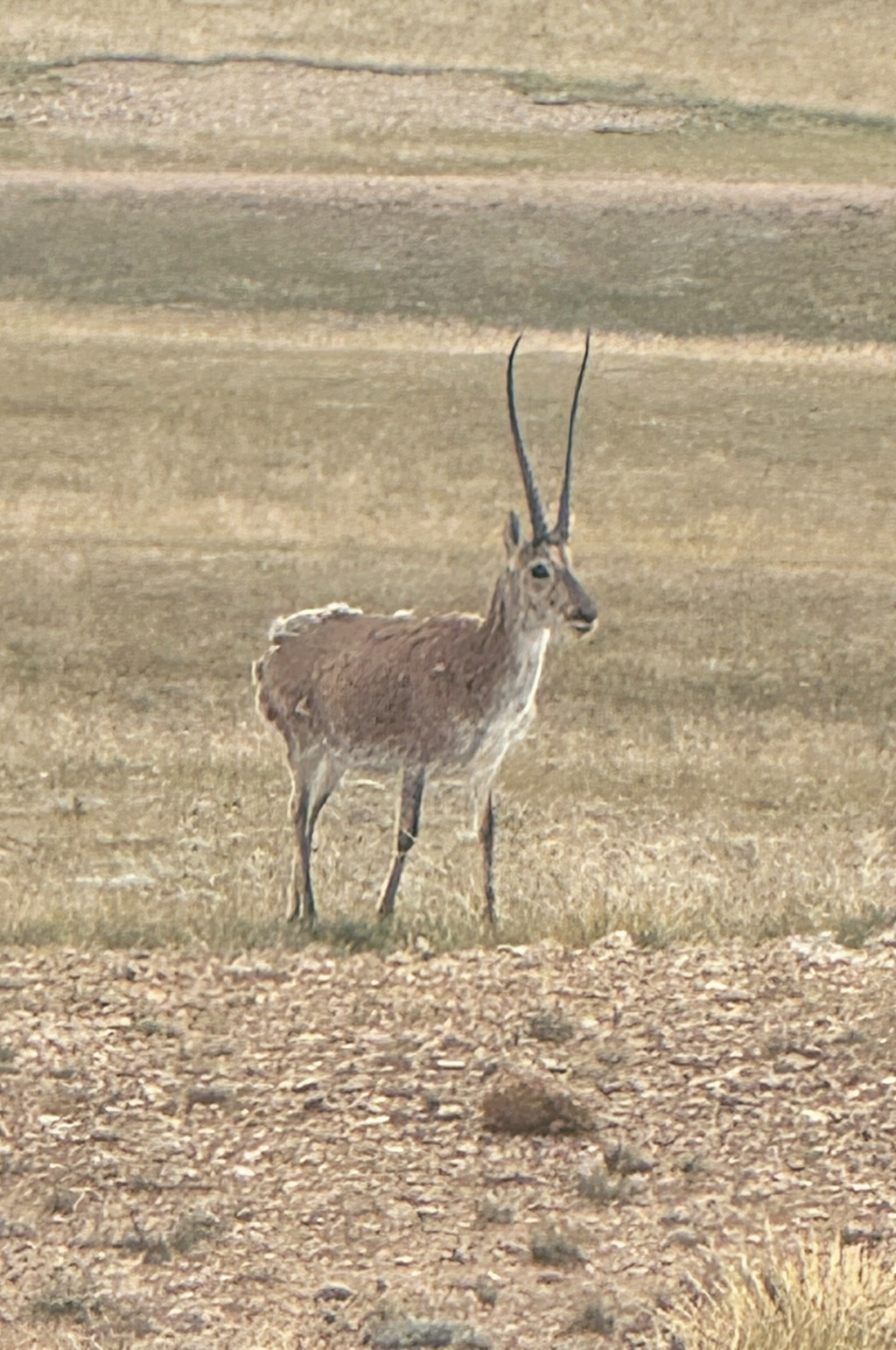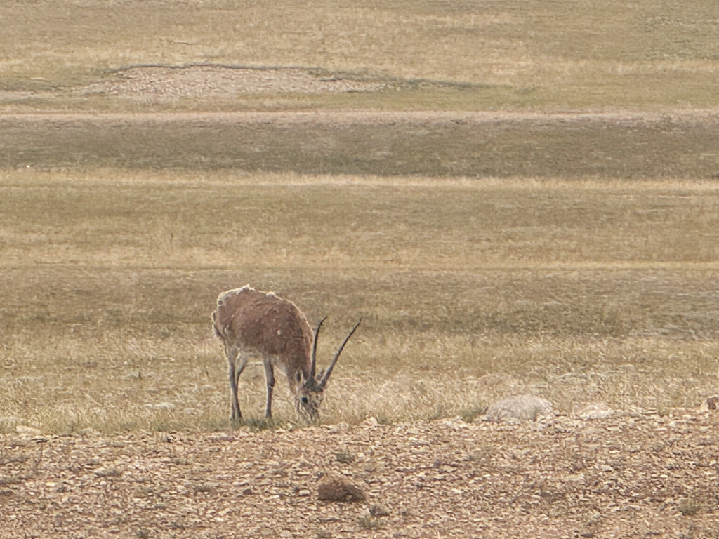 开出改则县再上G317往东,路上的景物已渐渐有了深秋初冬的模样,远处雪山的雪量明显增多,牧场的植被也开始稀疏泛黄,但不变的是湖泊依然众多,色彩各异如宝石般迷人,野生动物基本也围绕湖泊觅食,藏羚羊相对敏感怕人,藏野驴则无惧人车悠闲自在;混养的牦牛和羊群在藏獒的看护下也是埋头吃草,不闻世事;车行之路经常会有注意动物的警示牌,可见我们是过客,它们才是这里的主人,不侵害、不惊扰,客随主便才是正道。