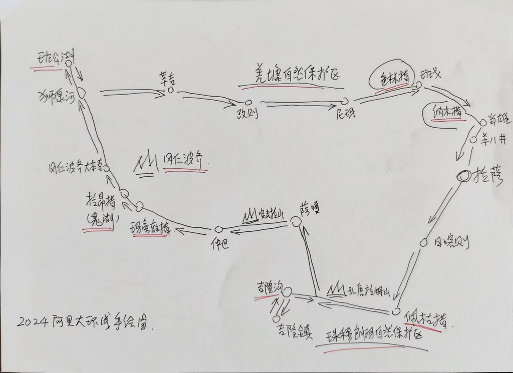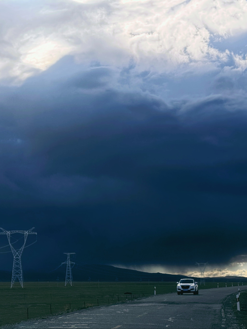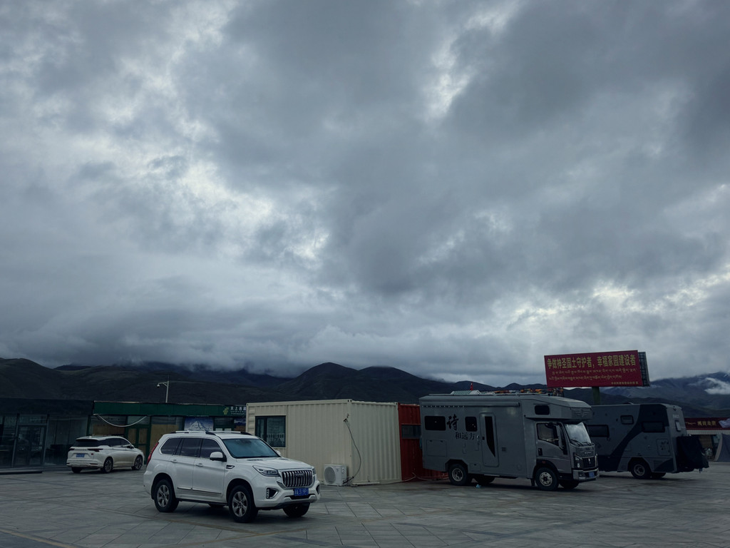 向下盘旋的山路令海拔快速下降,踏上G216时已是4000米左右,当我们看见萨嘎大桥时,也就意味着将重上G219(新藏线),穿过萨嘎县城和萨嘎村,翻越突击拉山垭口(海拔4920米),来到了仲巴县,这是日喀则地区与阿里地区交界处,跨过仲巴即到达心心念念的阿里了,心情无比激动……通过马攸桥边检站,正式进入阿里地区,这是西藏最远端的地方,无人区比比皆是,行驶在G219上,路牌逐渐出现了耳熟能详的地名:玛旁雍措、冈仁波齐、普兰、扎达、拉昂措(鬼湖)、狮泉河等等,目标越来越近了……过了玛旁雍措没多远,天边出现了大片乌云,覆盖面之大令人不寒而栗,远处的拉昂措(鬼湖)上空积聚了浓黑的云层一直向着冈仁波齐方向覆盖,行驶中的我们被其裹挟,雨点逐渐增大,天边的一丝落日余晖更增添了末日景象……而在回望玛旁雍措的方向时,令我们十分诧异,那边可是阳光灿烂的……鬼湖的传说看来错不了,在末日之景中行驶了约30分钟,终于在雨中到达目的地---冈仁波齐大本营!11个小时车程,平均海拔4600米的路程,胜利到达!扎西德勒!