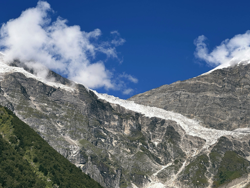 吃过早餐后,驾车晃晃悠悠进入吉隆沟,昨天因为天色已晚未能仔细观赏,今天晴空万里正是好时节……地名为沟,实为峡谷,沿着狭长的公路行驶,画风骤变令人惊讶……刚刚经过茂密山林,转眼就到了临渊石涯;急转弯处锋利岩石矗立路旁,不一会儿就是河流冲涮的浅滩湿地;但不变的是抬头望上均是雪山冰川,峡谷美妙之处正在于此:高原上的亚热带景观,上天的恩赐之地。