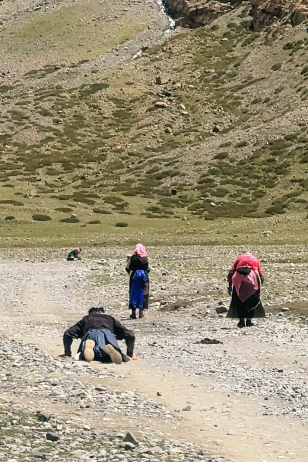 由于自驾车不允许进山,我们包了藏族同胞的出租车(400元/车)到经幡广场和曲古寺,冈仁波齐景区的路况保持原生态,从大门进入就是碎石路,山涧溪水蜿蜒相伴,偶遇的土拨鼠胖嘟嘟的十分可爱,转山的信众络绎不绝,磕长头朝拜的多为藏民,背包客则以一身户外装备示人;一方气定神闲顶礼膜拜,一方气喘吁吁步履蹒跚;而我们由于体能有限、意志薄弱,只能以车代步、打卡为主了,纯属观光客……在经幡广场拍照留念后,我们来到了曲古寺,这里就是转山的起点了,天啊!进门到这也有好几公里呢,还没算开始,幸亏包车了……曲古寺附近有两个茶馆,既可喝茶歇息也可采购转山所需物资,54公里的转山之路还有几个类似的补给点,在止热寺还有住宿的地方,但海拔在5000米左右,颇具挑战性,之后还需徒步翻越5600多米的垭口,一般转山需时两天,如果身体不适可呼叫救援,前提是必须走到车程可达的地方,转山的路径有相当长距离是崎岖小路,车是无法通过的,包车师傅说每天都有救援求助电话,而且以半夜时段居多,由此可见转山的艰辛非常人所及……两个多小时的体验之旅已令我们深感疲惫,徒步两三百米已是气喘如牛,好吧,回大本营歇一会儿。