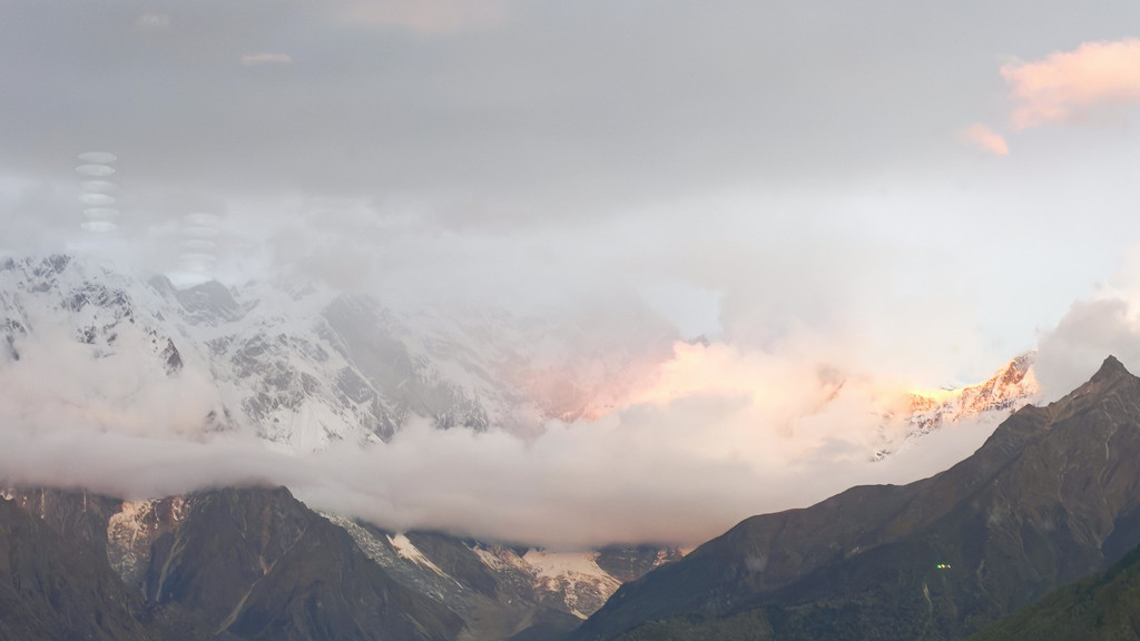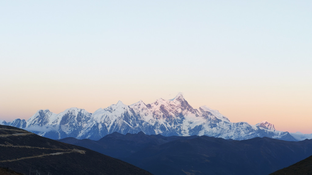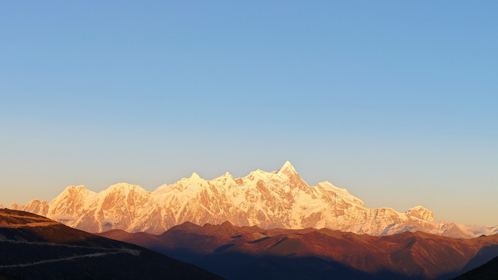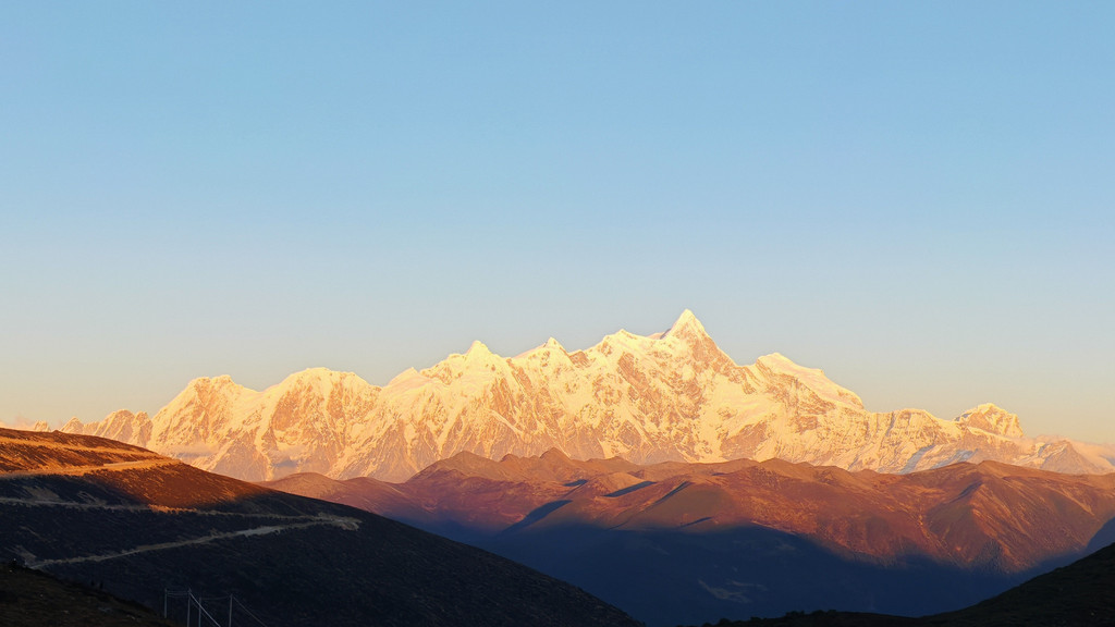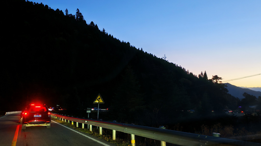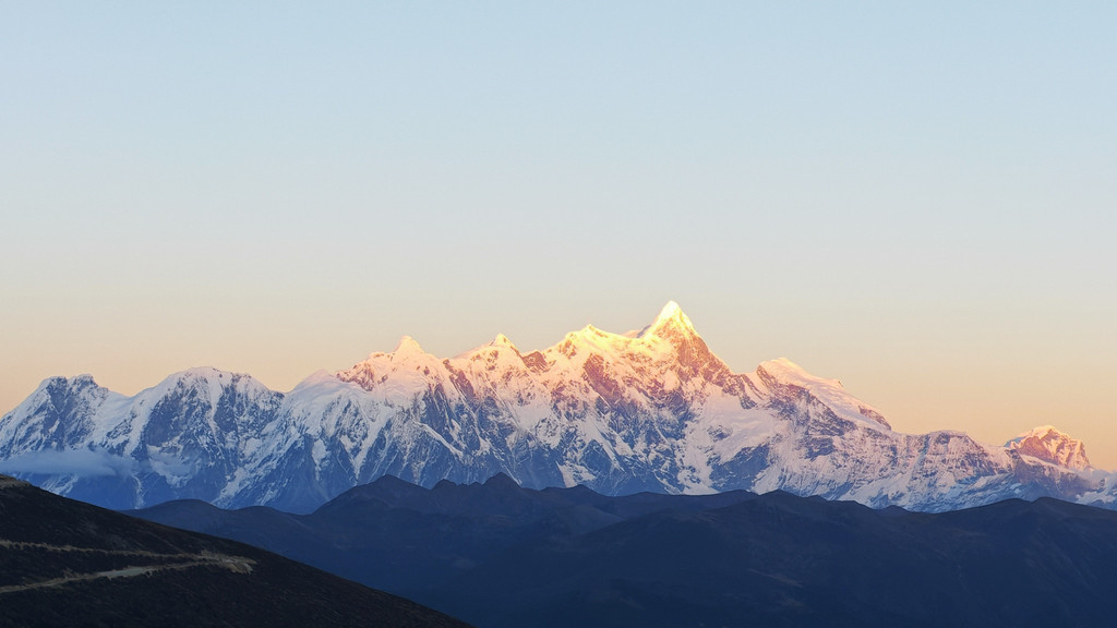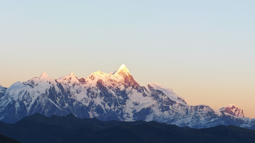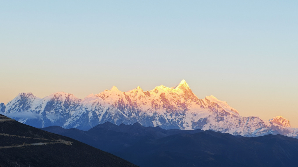 晚餐后沿着来时的路盘旋而上去色季拉山观景台,这时的车多了起来,只能排队上去,6点多抵达色季拉山观景台附近,周边已经停满了车,来看日落的人看来不少,很多人已经找好机位,架好相机随时做好了准备。我们在停车场还找到了一个停车位,经过昨天看日落被冻的经验,加上这个观景台处在高位又是风口位置,预计今天比昨天更冷一些,把最厚的冲锋衣和裤子都穿上,帽子,眼镜,口罩都准备好。6点40分我们找好观看位置,今天的天空很晴朗,南迦巴瓦峰的周边一片云都没有,看来今天是可以看到日落金山了,周边的人都很兴奋,不停的在拍照,我也不例外,眼睛都不敢眨,生怕错过了,手机不停的拍照,6点50分的时候,日落时分,光线瞬息万变,南迦巴瓦峰从最初的白色,逐渐被染上淡金、橘金,最后在山尖点燃最耀眼的光芒,整个过程只有短短的几分钟。暮色渐沉,南迦巴瓦峰慢慢呈现出深邃的蓝调。拍完照我的手都快被冻僵了,但很兴奋,传说中十人九不见它的全貌,这两天一路相伴相见,十人九不遇的日落金山,昨天遗憾收场,今天完美补上,这次来西藏没有遗憾。