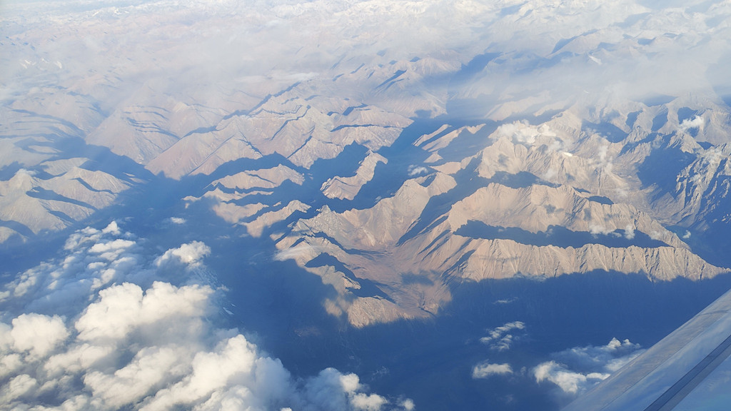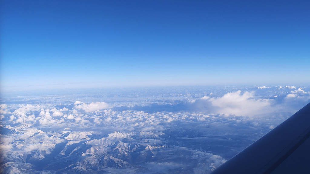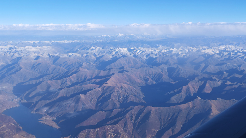 飞机穿过高原湖泊,乘务员提醒在开始下降了,窗外能见度很高,高山、河流都能看得很清晰,有些山峰还沾着残雪。