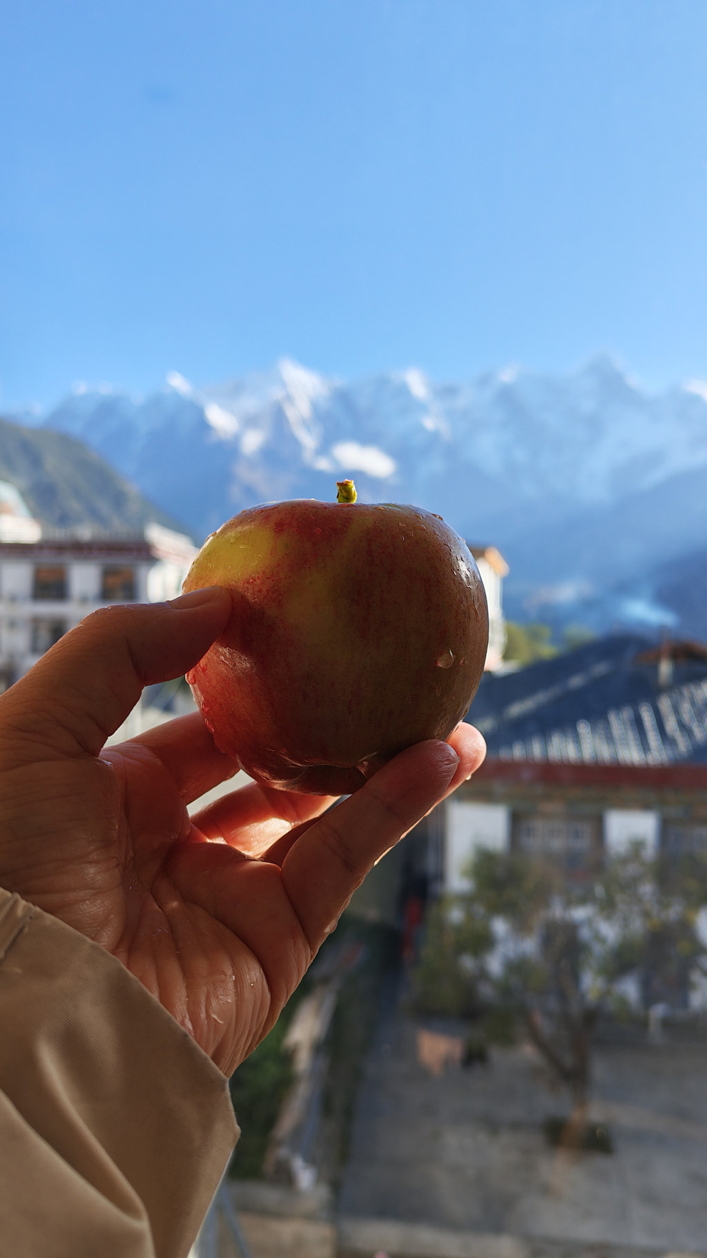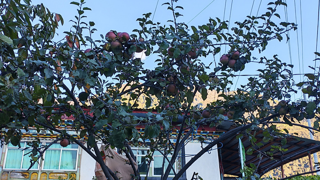 10月21日,我们睡到自然醒,昨晚9点多的时候,全村还停了一次电,我们这几天奔波劳碌,停电后就开始睡觉,这是这次外出旅游睡得最香的一晚,没有高反,3000多的海拔我们已经完全适应了(林芝的海拔2900多,索松村3000多一点),醒来拉开窗帘,早晨的南迦巴瓦峰整个全貌都露了出来,这边是西面,看不到日出,我们收拾好行李,先去附近吃早餐,早晨的索松村很安静,像一个与世隔绝的世外桃园,静谧中又带些寒气,有些民宿门口的有摘种苹果树,苹果正好熟了,游客可以直接摘来尝尝鲜。