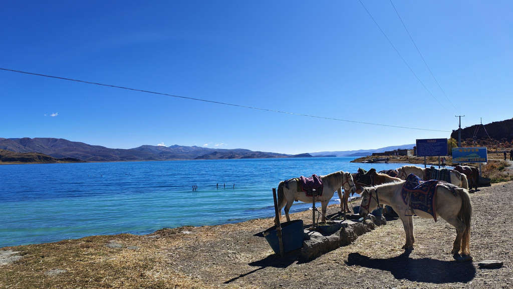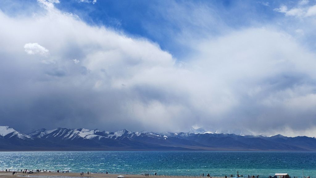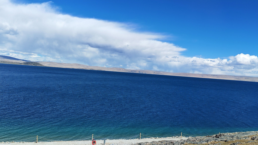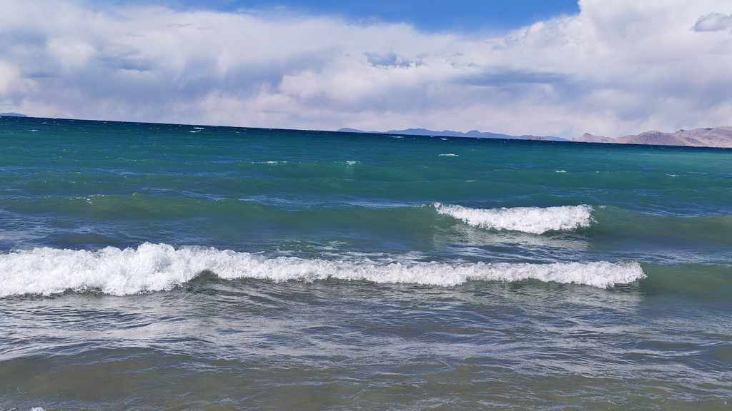 今天天气很好,但风有点大,湖水波涛汹涌,在天空的映衬下湛蓝如绸,与念青唐古拉雪山交映,宛如天神遗落的蓝宝石。