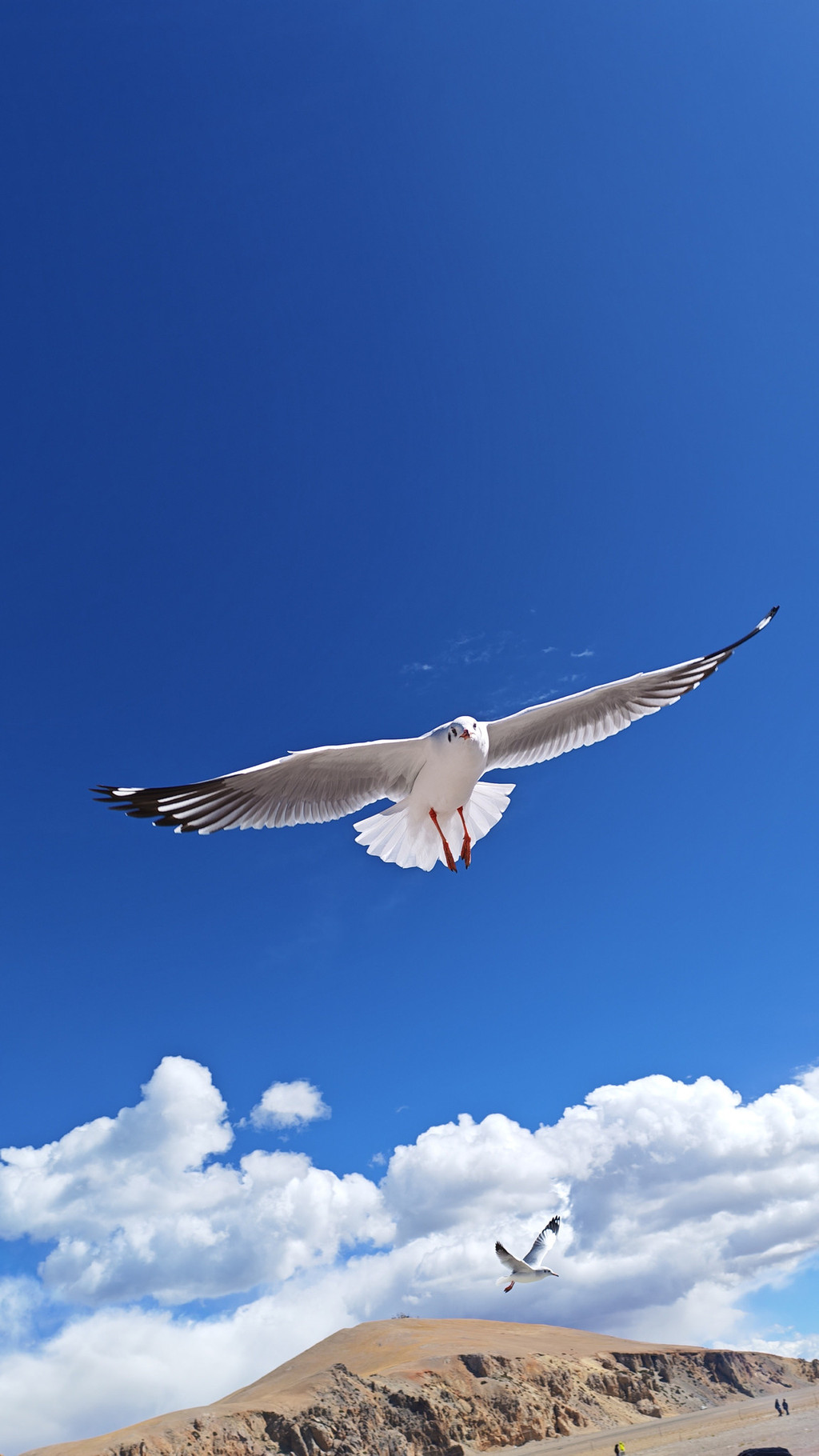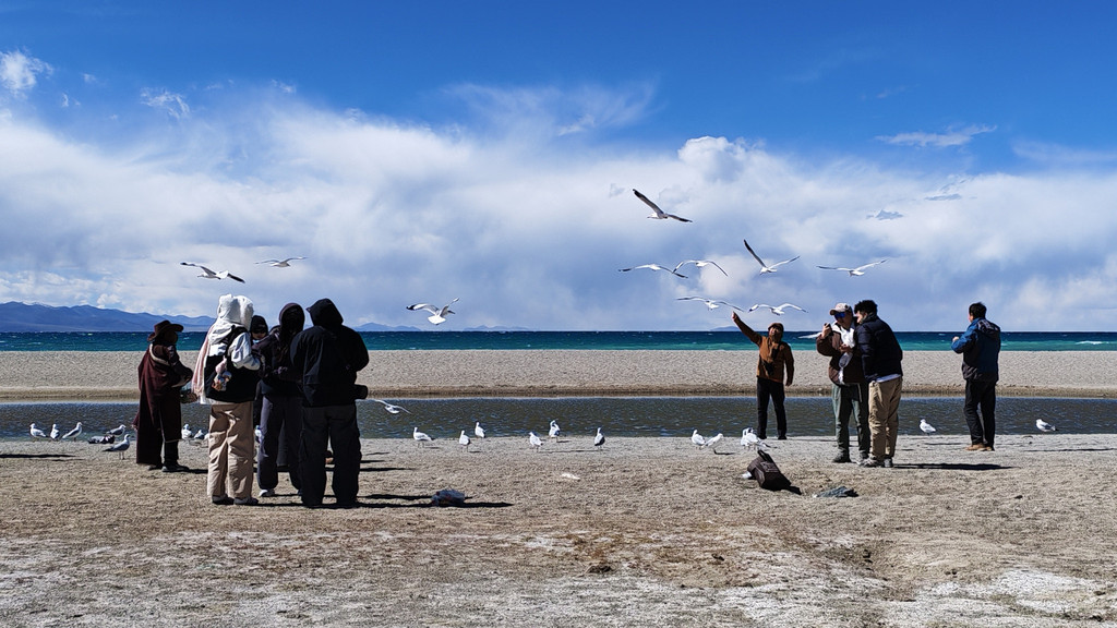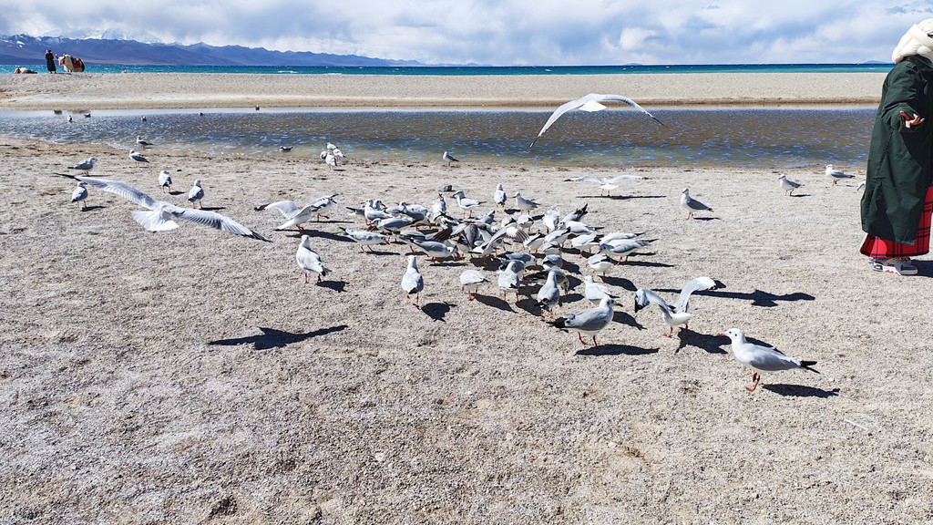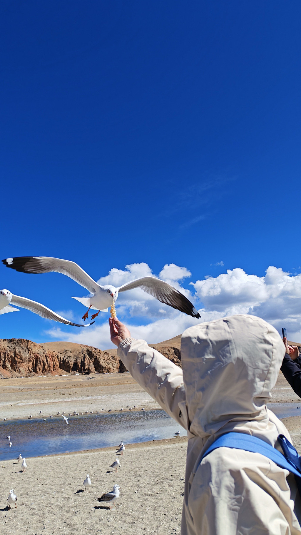 红嘴鸥掠过碧波,一点都不怕人,有很多游客在喂海鸥拍照,旁边有位藏民在兜售方便面,用于喂海鸥的,5元一包,还有一位中年藏族妇女,拉着一头白色的牦牛,游客可以骑牦牛拍照。我们也买了一包方便面喂海鸥,海鸥看到我们高举的食物,围绕在你身边着飞来飞去,我们也开心的跳起来,风太大,我们穿了一件厚的冲锋衣,身上还是够暖,头上把冲锋衣的帽子戴上后还把遮阳帽也戴上了,墨镜,口罩也戴上了,脸上,头上还是觉得吹的冷,冷风吹久后有点不太舒服,担心高反,喂完海鸥后我们沿路返回去坐车。