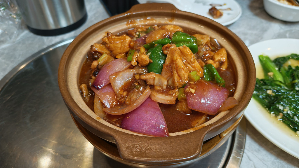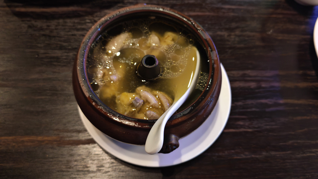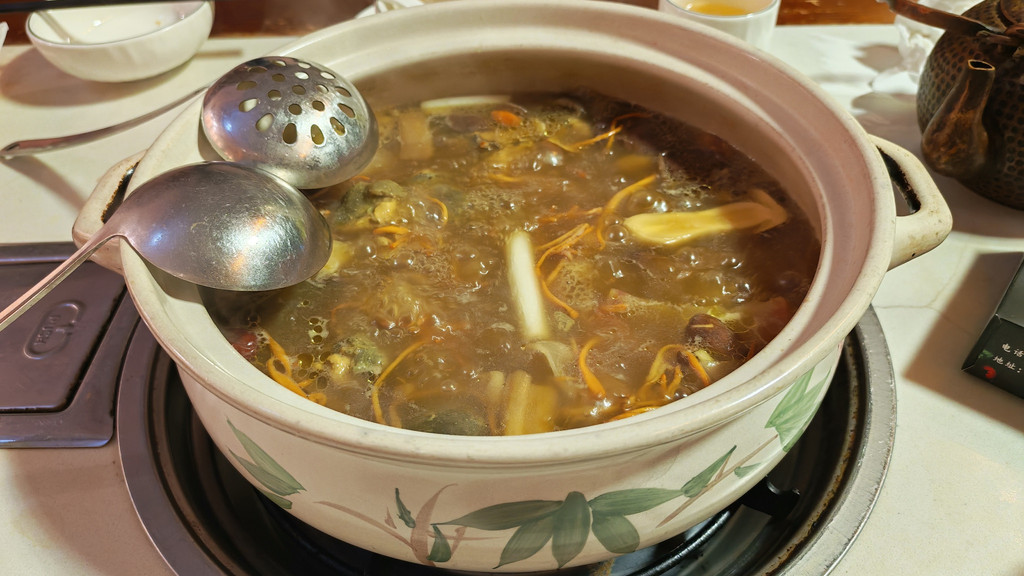 我们找了个安静的地方,停车休息了一下,离日落还有3个小时,先解决晚餐,这样看完日落回到林芝预计晚上8点,就不用再去找吃的了,下午5点左右我们在小镇上找到一家大众点评第一的石锅鸡——鲁朗纳麦石锅鸡庄园,双人石锅鸡套餐158元,比索松村便宜了一半的价格,店很大,已经有18年的历史,我们到达时,也有一部自驾游的旅客去吃饭。鸡肉还有分嫩鸡还是老鸡,我们选了老鸡+两份青菜,一个石锅上桌时,发现分量很大,预计四个人差不多,鸡肉也很多,入口富有弹性,汤汁浓郁鲜美,喝起来暖身又滋补,这也是我们这次来西藏吃过最好吃的一餐。