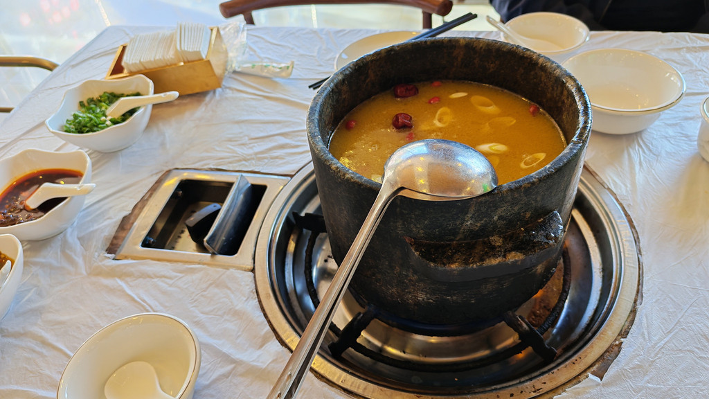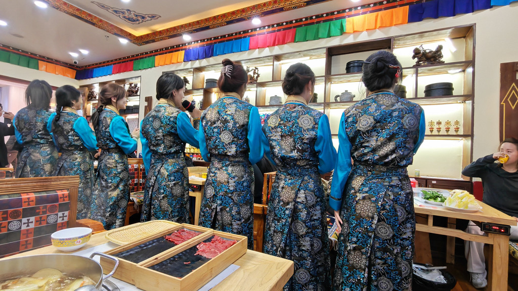 从药王山下来,离酒店只有几百米,队友走着走也就陪我一直逛到晚饭后才回去酒店,我们边走边逛着回酒店,路过一个商城,去吃了田村酸汤牦牛肉火锅,店内很多客人,点了牦牛肉火锅,口感一般般,肉质硬,不适合打火锅,可能适合焖,吃到一半时店里突然有一群藏族姑娘载歌载舞,好不欢快。今晚要回去早点休息,明天要去高海拔的纳木措,到时还要经过5100多米海拔的那根拉山口。