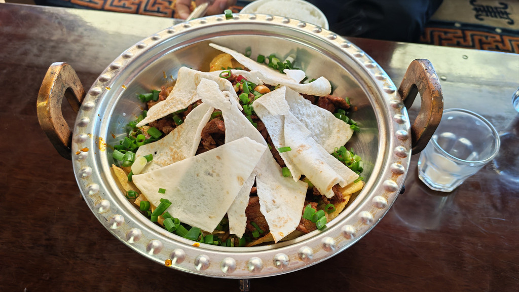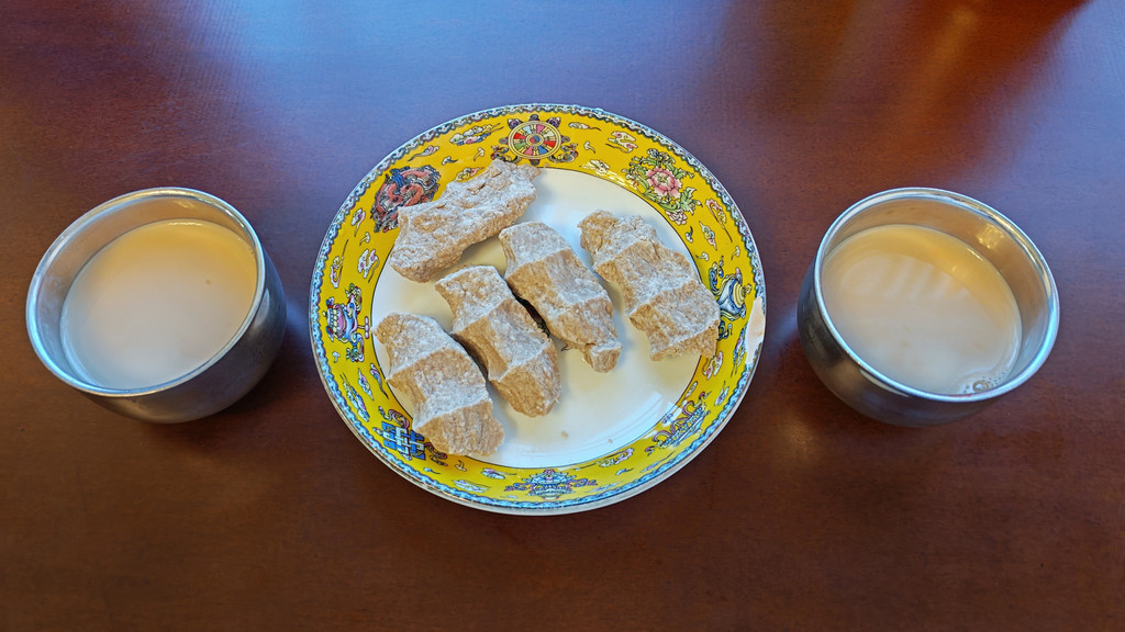 预定了西藏博物馆对面的酒店,靠着马路,淡季价格160多元一晚,有送5L高浓度缺氧机带鼻吸管1份(但没用上),离罗布林卡也很近,酒店还免费升级了房间,但没有原房型阳光这么好,还是用回原房型。可能是在云南过度了一下,以为抵达西藏后会高反,当天哪里都去不了,没想到中午休息了一下后,并没有什么高反。中午去酒店楼下 的罗林藏餐厅尝试一下藏餐,进门都是本地藏民在吃饭,点了一份牛肉焖锅(188元,以为很大份量,也就正好两人的份量),看每个桌子都有一壶茶,问服务员才知道那就是甜茶,我们也点了一小壶(6元),牦牛肉特别香,上面的薄饼加上牛肉也很好吃,有点微辣,也感受到西藏的物价确实贵。