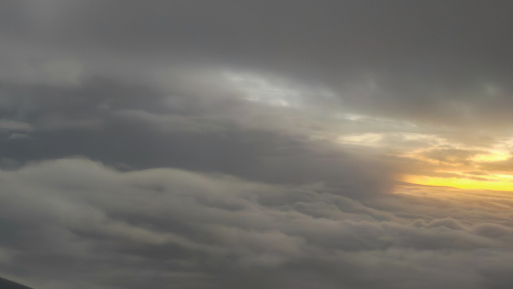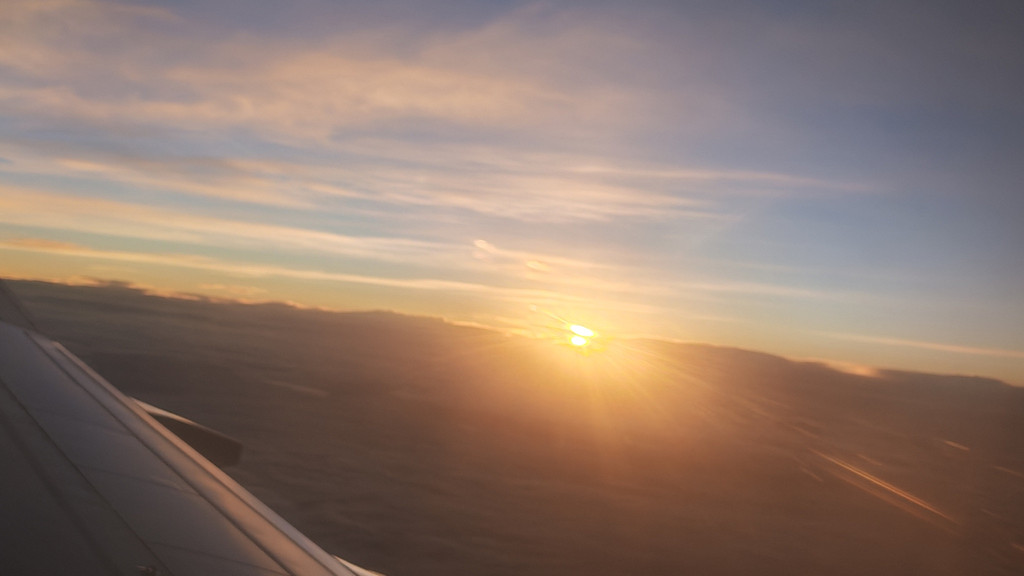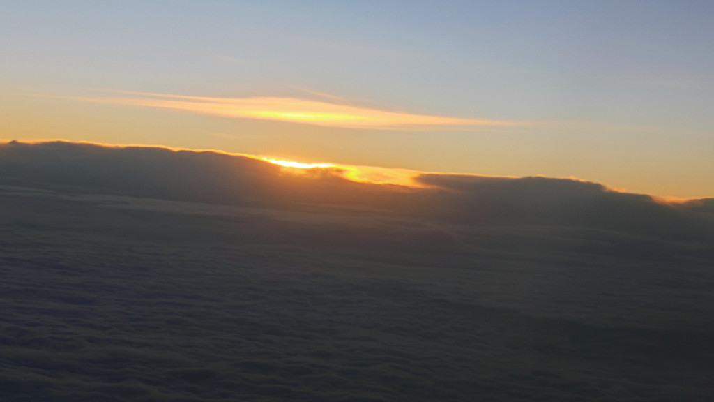 10月17日凌晨4点起床,4点半出发去机场,6点35分的飞机,虽然时间很早,可是机场已经人声鼎沸,看来坐早班机的人还是比较多。一上机开始昏昏欲睡,后来被靠窗的光线照耀到眼睛被唤醒了,原来是日出了,第一次在飞机上看到日出,舷窗外的天际已洇开一抹极淡的金,那金色起初像融化的蜂蜜,顺着云层的褶皱缓缓流淌,转瞬便凝成锐利的光刃,将厚重的云絮劈出一道亮缝。第一缕朝阳刺破云层时,整个世界骤然亮了,不是地面日出的温柔铺展,而是带着金属质感的强光,瞬间铺满舷窗,将云海染成无边的碎金。云涛在脚下翻滚,每一朵云的边缘都镶着璀璨的光边,仿佛踩在洒满钻石的雪原上,连呼吸都跟着变得轻盈。