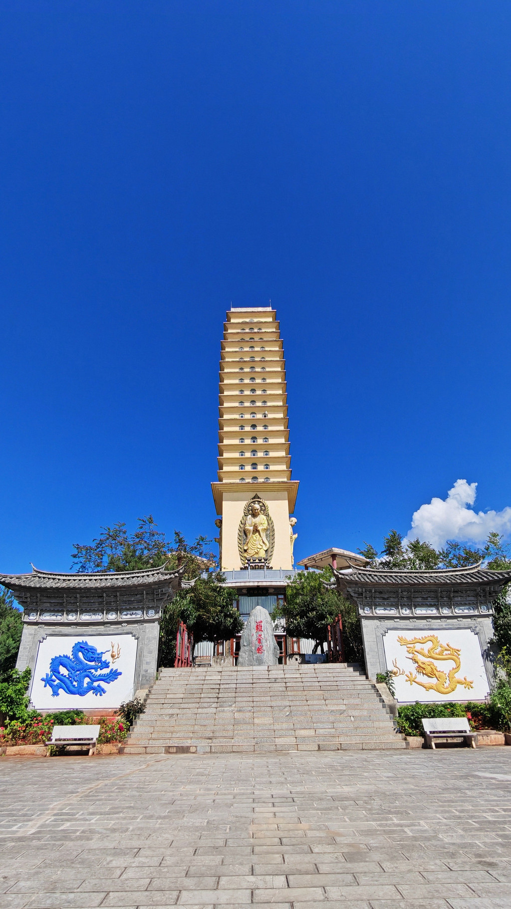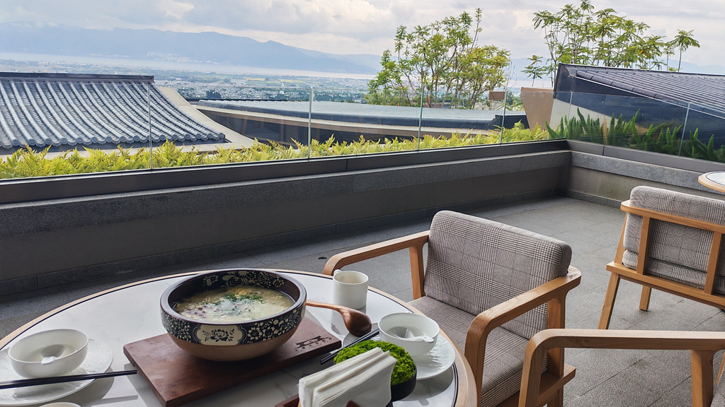 10月16日我们是下午回昆明的高铁,还有一上午,在大理古城逛了一圈,游客不多,碰到的多是一些本地的叔叔阿姨去买菜,开车去崇圣寺三塔,天龙八部的拍摄基地,门票都不便宜,只是在门口转了一圈,去天龙八部的拍摄基地是盘山而上的山道,空气很好,下山时转到另一条山路上,想上去看看是什么风景,没想到转到王宫五星级酒店,进去参观了一下,酒店大堂的设计很有特色,和队友在那里拍照拍了半天,再看时间有点来不及,在王宫酒店吃了个午餐,94元过桥米线的单人套餐。