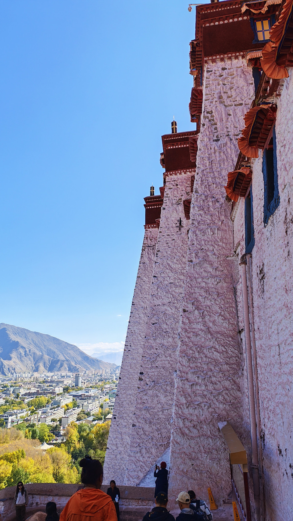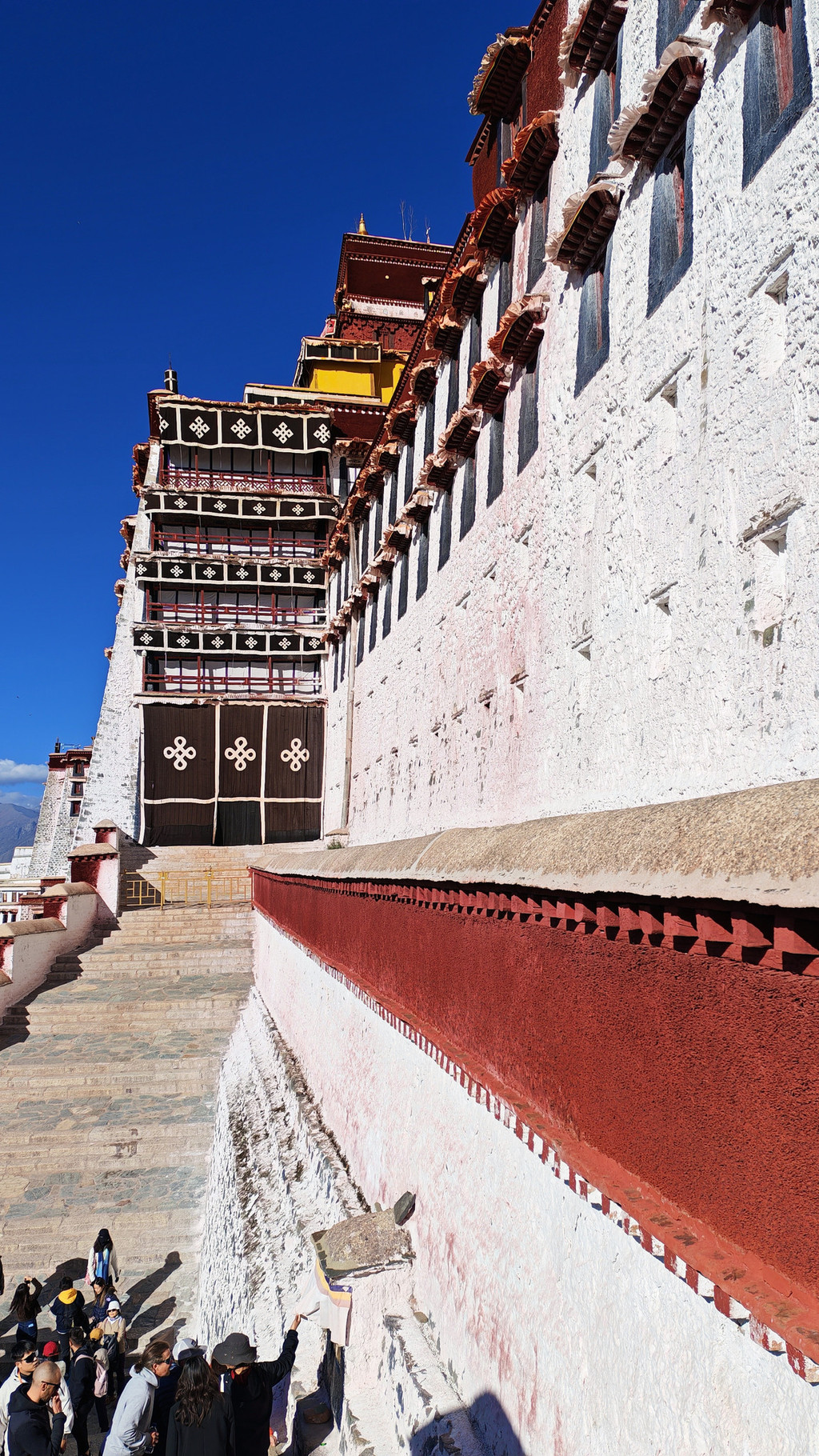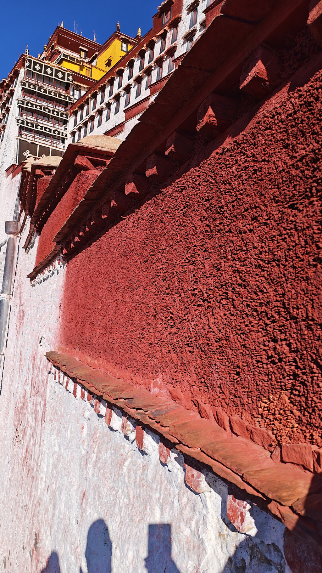 参观完无字碑要沿着台阶而上,台阶旁边的白墙则是白宫的外墙,白色象征着纯洁、和平和信仰,其墙壁由石灰、白糖和牛奶混合而成,能反射阳光,降低宫殿内部温度。红墙主要是由“白玛草”(柽柳)堆砌而成,“白玛草”(柽柳)是一种野生落叶小乔木,生长在高寒地区,工匠采集50厘米左右,主杆无分叉的枝干,去皮晒干后切成小段。将干燥的“白玛草”用牛皮绳捆扎成小束,捆扎好的草束铺一层,加一层黏土夯实,重复砌筑,每铺设两层后用木签固定,防止松动,有助于减轻墙体重量,非常结实,冬季保暖,夏季凉爽。用藏红花等熬制的颜色染成红色,不仅色彩鲜艳,还具有防腐、防虫的功能。导游说每年藏历的9月前后都要重新刷一次墙,现在已经启动刷墙了,大概15天完成,都是由自愿者来完成,刷墙时都是泼洒而下,每个参与者都感到这是一份特别神圣和荣耀的工作,导游也要参与,每天安排60人轮流参与,他说12月份来,这些颜色就特别鲜艳。