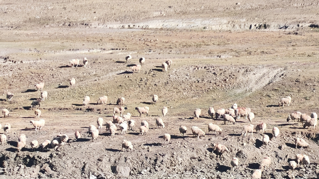 去羊湖的路与昨天不一样,昨天基本上都是高速,今天走了一小段高速后,全是村道,经过了很多村庄,经常会在路上遇到一群牛或红屁股的羊,村民家门口还真如网上所说,很多牛粪晒在墙上,有些晒好的牛粪堆的很高,牛粪堆的越多的就表示越有钱的人家,也确实,一头羊要1000多元,一头牦牛要几千到上万元,大多数村民都是养一群牛或一群羊,全车的旅客都觉得这里的藏民其实很富裕。