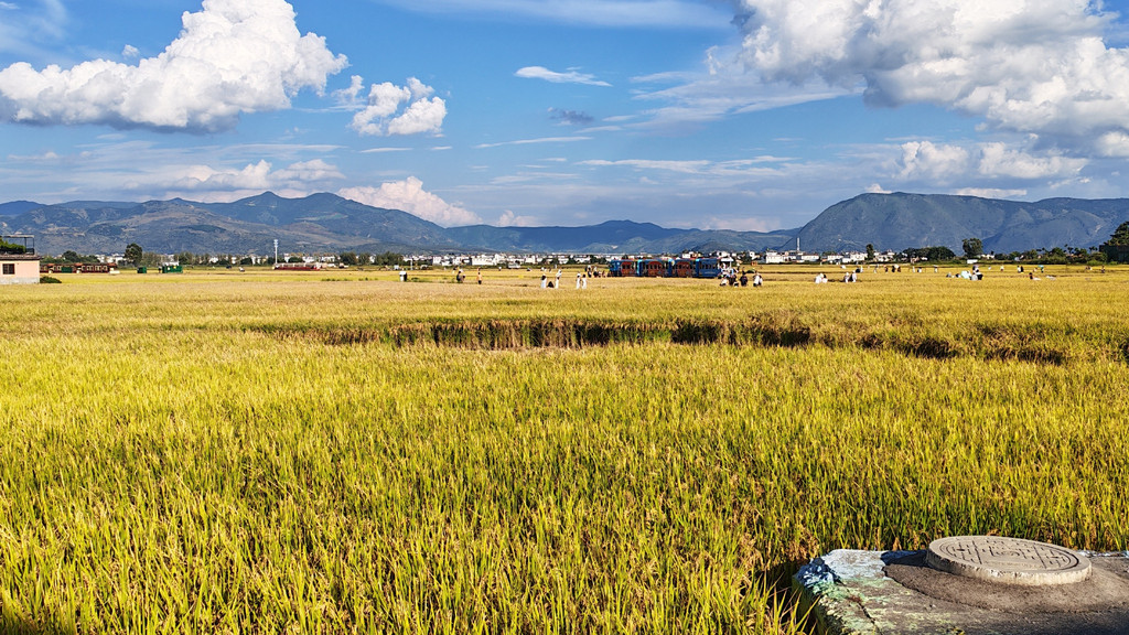 从双廊古镇出来的,沿途有很多村庄,喜洲古镇也是很多网红推荐的打卡点,喜洲古镇的稻田正开始金黄色,很多人在稻田处拍照打卡,还有小火车在稻田里边慢悠悠的开动着。