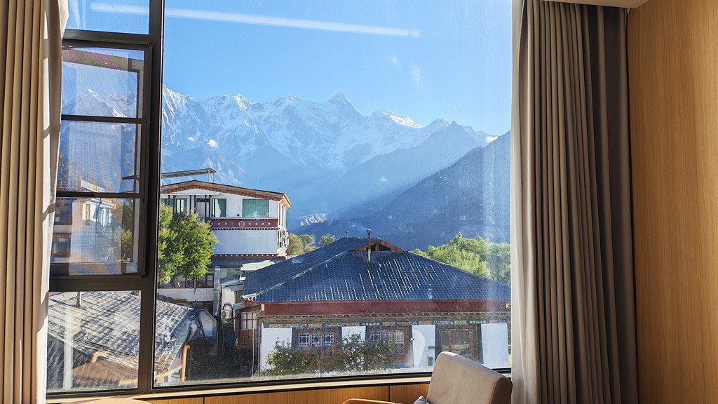 索松村不算很大,民宿主要集中在南迦巴瓦峰山脚下,整个南迦巴瓦峰感觉非常壮观,下午4点多我们到了所定的酒店——索松山居酒店,店长给我们办理了入住,原先订的是山景房,淡季跟店长沟通后,免费给我们升级了观景房,打开窗帘,扑面而来的南迦巴瓦峰神山震撼,这个时点山峰全貌都露出来了,感觉今天很有希望可以看到日落金山。