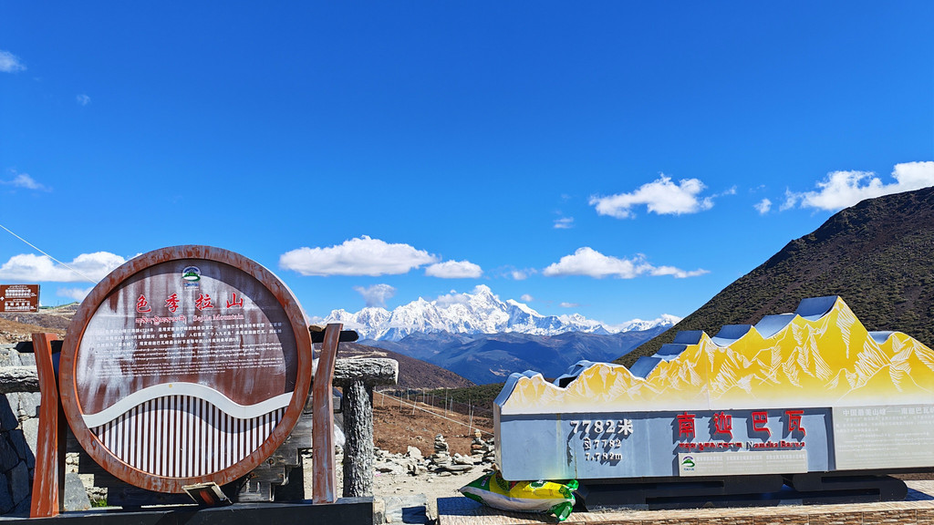 色季拉山口:是川藏公路318国道的必经之地,海拔4728米,这里视野开阔,是观赏南迦巴瓦峰的最佳场所之一,距离南迦巴瓦峰直线距离约12公里,今天天气很晴朗,可清晰远眺其峻美雄姿,跟索松村看到有一点点不同,视觉上也同样很震撼,我突然有一个想法,同时也想起昨天那个乘客说的话,观看日落金山最美的是在色季拉山观景台,我叫队友把我们今天租的车推迟归还,再租多两小时,在这里等观看完日落再回去,也许今天我们能看到日落金山。