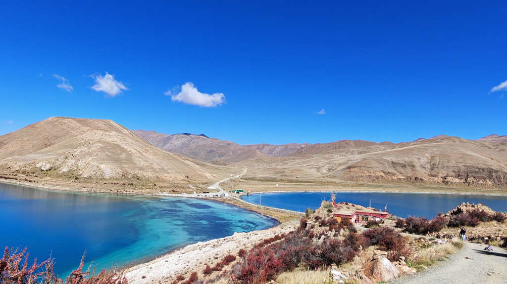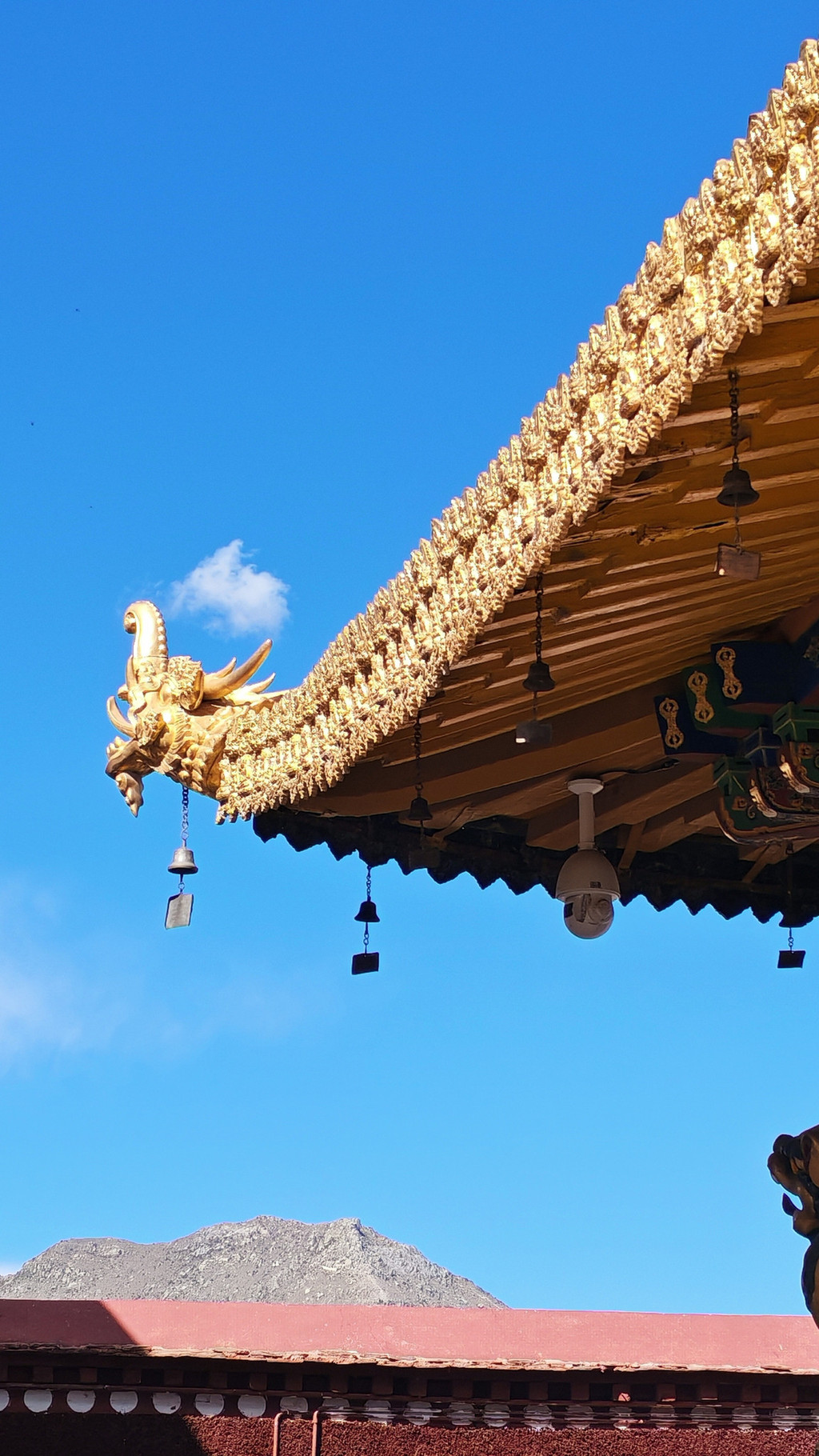 从远处看寺庙在一座小山上,整体呈方形,红墙金顶,还真有一种遗世孤独的感觉。日托寺海拔约4500米,站在寺庙前,可360度全景观赏羊卓雍错的碧蓝湖水,与远处的雪山构成绝美画卷。