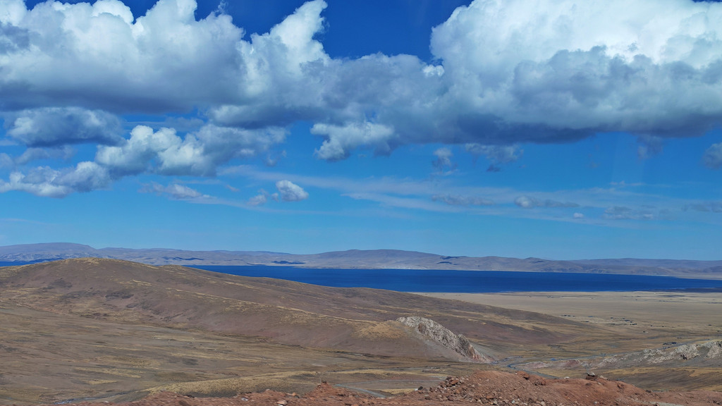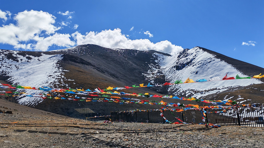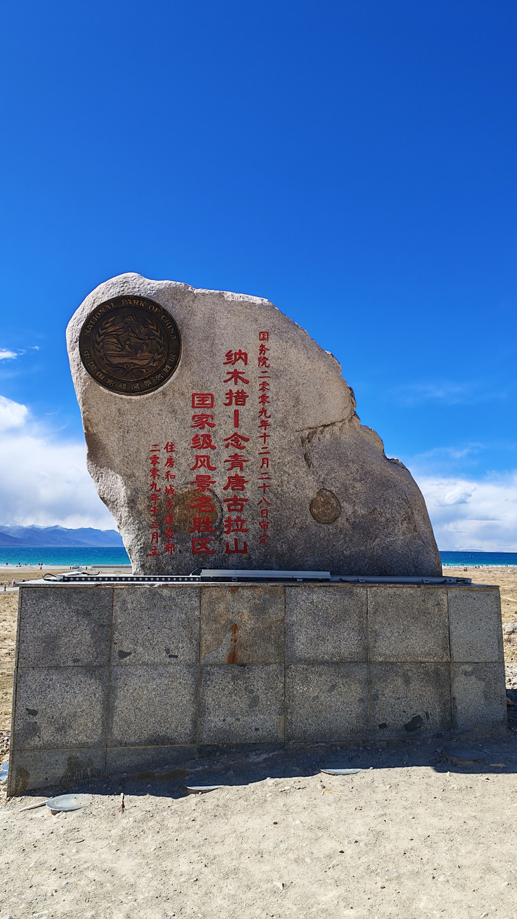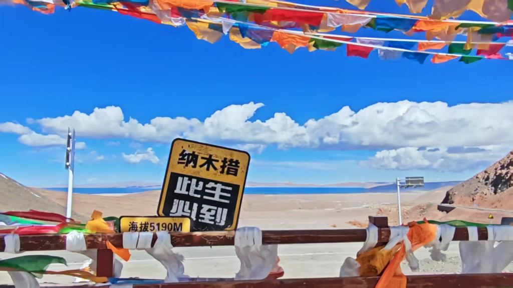 那根拉山口属于号称生命禁区的海拔5000米以上的山口,这里风大、气温低,空气稀薄 。山口立有标明海拔高度的石碑,玛尼堆上挂满了经幡,承载着藏民们的信仰和愿望。经幡在山口的风吹下猎猎作响,时不时有藏民来推售经幡,说是今天天气好,可以帮忙挂经幡,帮家人朋友祈福,游客全都是外地来的,信仰不同,没看到有人购买。从山口向北望去,可以眺望到碧蓝的纳木错湖,美丽的圣湖犹如一面宝镜嵌在天际 。