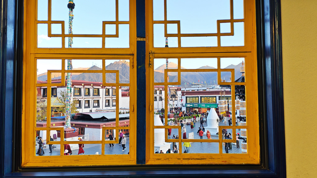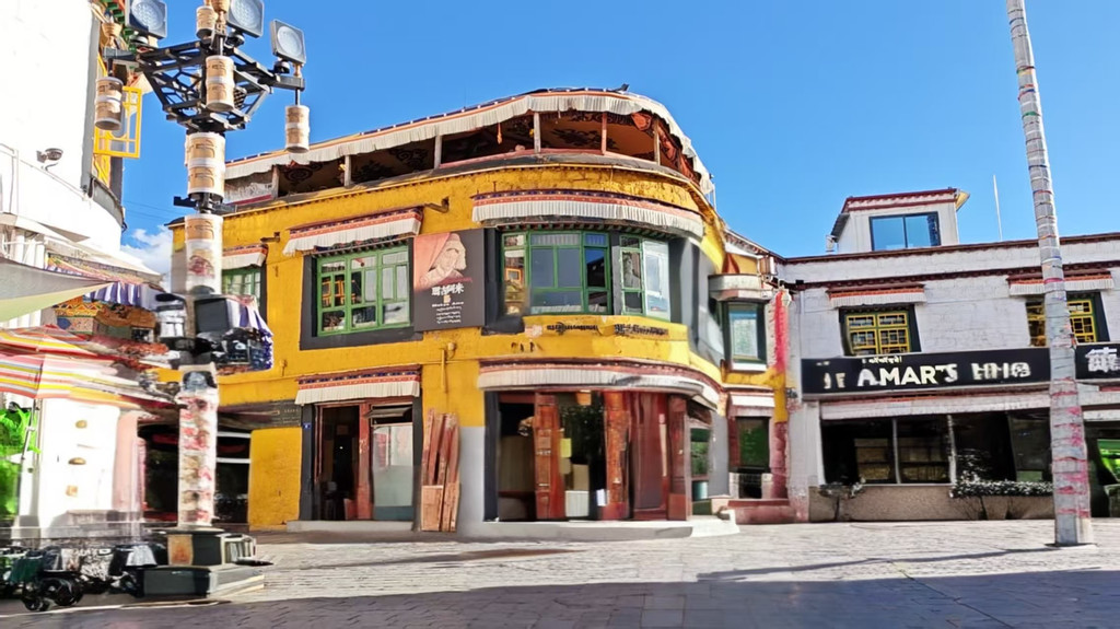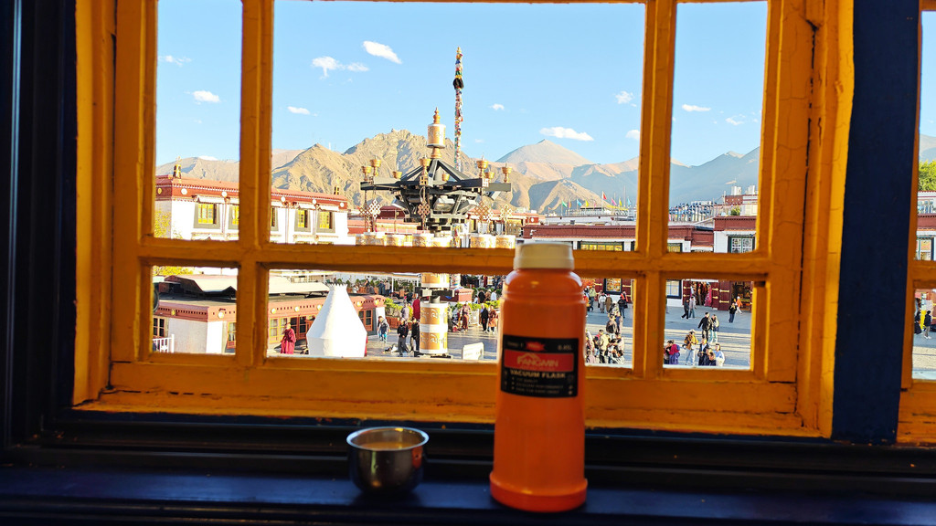 逛八廓街要按照顺时针的方向,一直沿着人流往前走,途经网红打卡点阿刁奶茶店,在街上也会看到很多朝拜者三步一跪的前往大昭寺,街边的商铺都在售卖藏族服饰以及唐卡,也有一些在现场画唐卡的,在这条街上是能深切的感受到拉萨信仰的所在地。听说希热风措楼顶咖啡厅的四楼是打卡布达拉宫全貌的绝佳机位(我们没有进去),在街的中心有一座黄色的房子,玛吉阿米餐厅,据说这个餐厅非常火,火的原因是因为六世达赖仓央嘉措的诗句:世界安的双全法,不负如来不负卿。一直只知道不负如来不负卿这句诗,没想到出处在这里。甜茶是西藏必喝一种茶,据说喝甜茶和可乐可以抗高反(好象是有点作用,队友以前从不喝可乐,这次西藏回去居然时不时找可乐喝),我们到大昭寺旁边的帕廓文化茶馆二楼,找了一个靠窗的位置,很多藏民在那里喝甜茶聊天,我们也点了一磅甜茶(一小壶)5元和一份加了点白糖的糌巴(糌巴有点粗糙,我们吃不习惯,但看藏民很喜欢),甜茶在西藏是最便宜的饮品了,每天必点,靠窗的位置,正好面对着大昭寺,看着楼下熙熙攘攘的人群以及三步一拜的朝拜者,感觉世界都安静了,这里就是佛教信仰者的天堂,离天最近的地方。