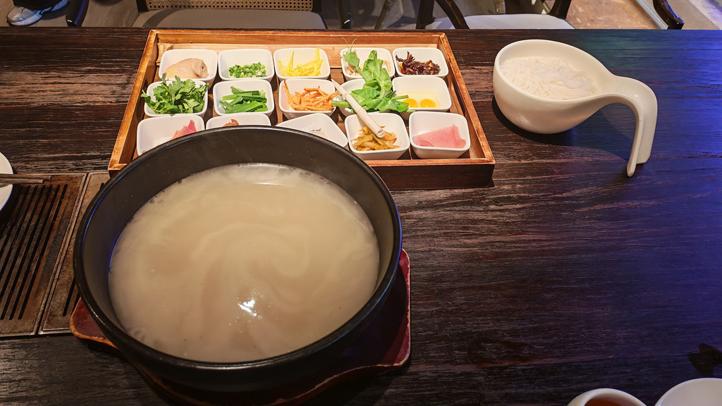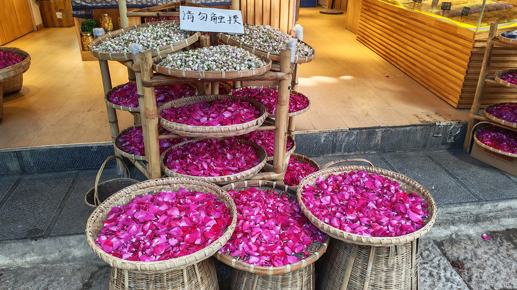 走出大观园,去了酒店附近的大观篆新农贸市场,很接地气的市场,是昆明最具影响力的综合性农贸市场之一,24小时不停业,有650多个摊位,日常的人流量约4-5万人,节假日更是高达10万人,摊位出售的品种很齐全,在这里能看到昆明的人间烟火气。逛完大观篆新农贸市场,快到下午5点,骑上电驴子前往昆明老街,去打卡一下4A景点及解决一下晚餐,老街纵横交错,明清老宅与民国洋楼相映成趣,钱王街上,老字号与市井烟火交织,百年福临堂,马家大院,扎染布色彩斑斓,巷口摊档烧饵块金黄酥脆,豆花米线酸辣开胃,街上很多鲜花饼店,到处飘出鲜花饼的甜香,每家饼店都在吆喝着让你尝一尝各种饼,嘉华鲜花饼的玫瑰鲜花饼特别香,整条街试吃下来还是觉得玫瑰鲜花饼比较好吃,我已经快吃饱了,队友不吃饼,夜幕降临的时候还是要找餐厅吃饭,走到街的另一头,转角遇到了一个滇池睡美人餐厅,环境优雅安静,与刚才街上吵吵闹闹声形成了鲜明的对比,我们点了一个米线套餐(来云南必吃),一盅气锅鸡汤(云南的特色),共72元,价格实惠,上米线时一整套看上去色香味俱全,味道很正宗,服务员还免费赠送了两份鲜花奶白酒小甜品。
