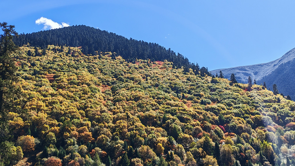 中午我们来到林芝镇解决午餐,没想到还有一个林芝镇,路边有几家餐馆,依然是川菜馆为主。过了林芝镇就是318国道了,很多人都说西藏最美的风景都在318国道上,车子徐徐驶入色季拉山,色季拉山位于西藏林芝市以东,是尼洋河流域与帕龙藏布江的分水岭,属念青唐古拉山脉。拥有世界上最高的林线,海拔4600米以上,以冷杉、云杉为主的针叶林被高山灌丛和杜鹃花取代。这里植被垂直分布明显,从热带季雨林到高山荒漠冰缘植被,共7个自然带,物种丰富度冠绝中国。当车子进入色季拉山时,也进入了最美的色季拉山的秋季,漫山遍野的林木褪去青绿,披上金黄、橙红、赭石等色彩的华服。金黄的落叶松如阳光洒落在山间,火红的枫树像燃烧的火焰点缀其间,偶尔露出的青黛色岩石与洁白的雪峰,为这幅画卷添上沉稳的底色,整座山的颜色五彩斑斓,美不胜收,我已经被这样色彩惊艳到无法形容。