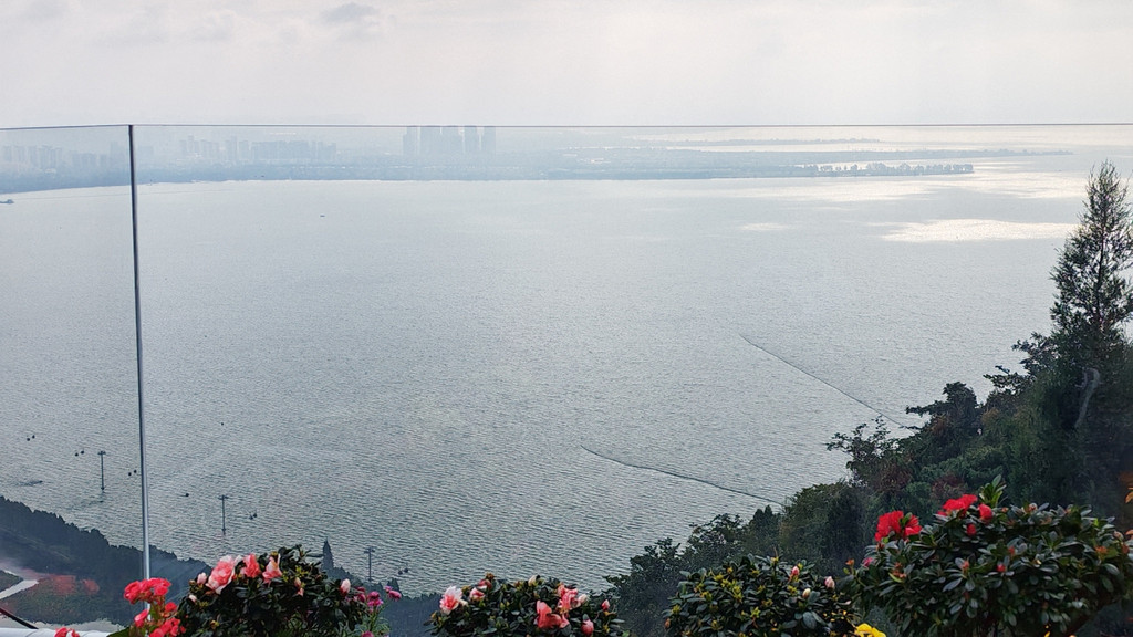 早餐过后,打车前往滇池,滇池是古滇国的发祥地,是中国西南地区最大的淡水湖,有“高原明珠”之称,傍西山而居,自然资源丰富,景色秀美,周边有大观公园(大观楼)、海埂公园,西山景区(龙门)以及众多的湿地公园。我们预定了滇池大坝到西山风景区方向上行和下行的缆车120元/人(每个中国移动全球通可以减免30元),花了180元,今天是阴天,坐在缆车上向下望,滇池很大,面积330平方千米,湖面好似大海般波澜壮阔。上到山顶,从山顶向下看滇池,500里滇池尽收眼底。山顶很多叔叔阿姨在拍照游玩,这个季节正是退休的叔叔阿姨们出游的好时节。