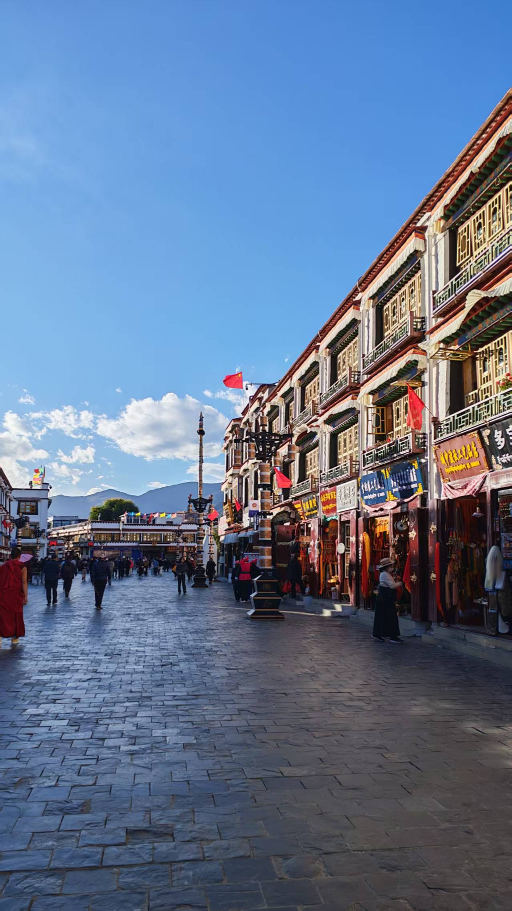参观完大昭寺来到八廓街,时间已经4点多,想去扎基寺转转有点来不及了,如果时间来的及可以去扎基寺观看一场辩经,曾经在活佛的纪录片看过,虽然听不懂藏语,可以从他们的动作和表情,也能看到一场精彩的辩论,这边的寺庙一般4点半就不接受游客了,这次的时间安排不上了,下一次来了再去参观吧。只能在八廓街逛逛,我们不想消耗太多体力,依然跑去昨天的帕廓文化茶馆二楼喝甜茶,还是老位置,队友点了一碗藏面,吃起来比较硬,不太习惯,还是觉得甜茶实惠又好喝。休息过后队友觉得有点累,可能是昨晚没休息好,有点高反(在高原地区最重要的是要休息好),我让他回酒店休息,我打算徒步去布达拉宫广场和药王山,因为八廓街走出来打车也有点路程,不如走路过去,走出八廓街,对面是不夜城,从不夜城穿过去不远处就是药王山了,不夜城是大众化的商业街,没什么吸引人逛的地方,穿过不夜城就到达了布达拉宫广场,在这里可以拍到布达拉宫广场的全貌,有很多人在广场拍照打卡,再往前走1-200米就到了药王山,不需要预约,观景台都是拿着50元在那里拍照打卡的游客,我借了一张50元拍了一张照片,也算是来过了。