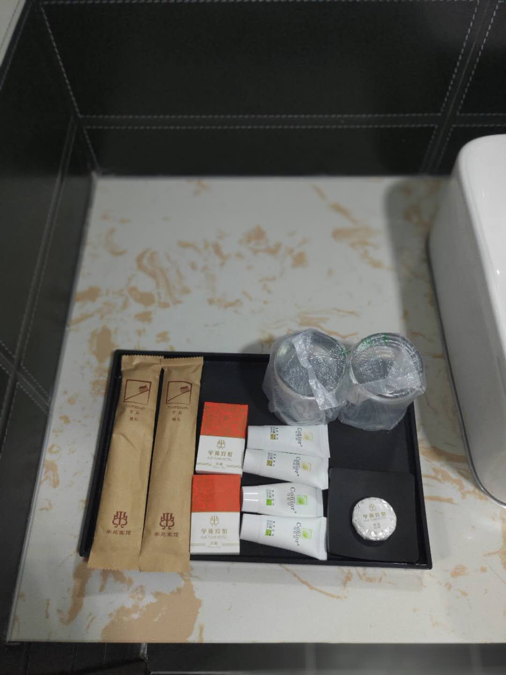 宾馆的一次性用品沐浴露、洗发水都很精致,据说和四星级酒店是相同标准的。