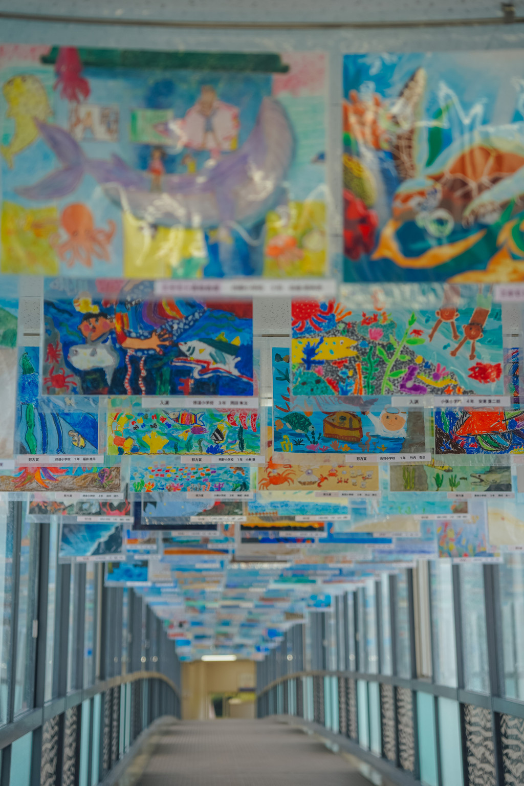 这条长廊里悬挂了许许多多的绘画作品,孩子们用童真的笔触描绘着他们眼中的御木本真珠岛以及珍珠捕捞制作的过程,非常有爱。