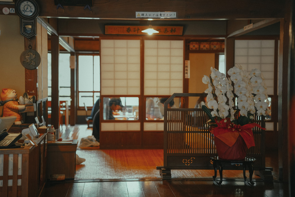 这里的建筑造型十分复古,大大的日式灯笼招牌格外醒目。不过最引人注目的还是位于大堂中央这只巨大的招财猫——多福。