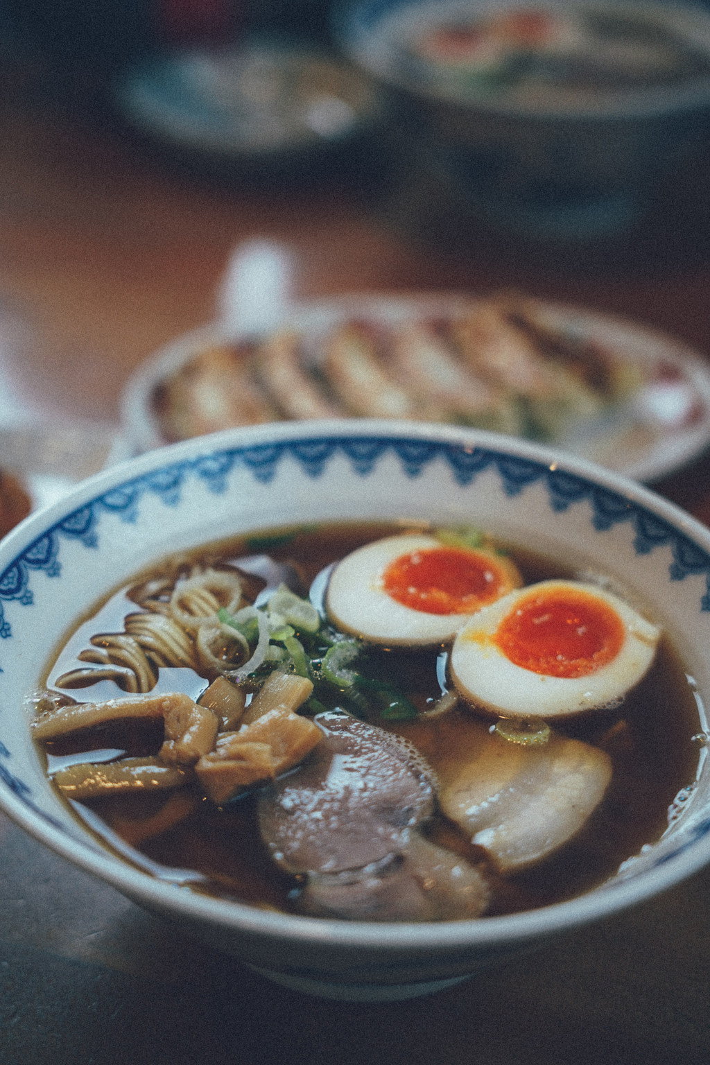 日式拉面中,高山拉面也尤为出名,成为地方特色。汤头选用鸡骨、柴鱼片、蔬菜,以酱油和味淋调味,汤汁颜色透亮,口味清淡,带有微微甜味。再配上酥脆的煎饺,这一顿丰盛的午餐,点燃一下午的活力!