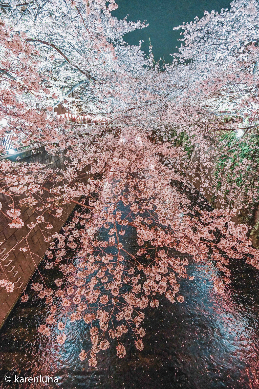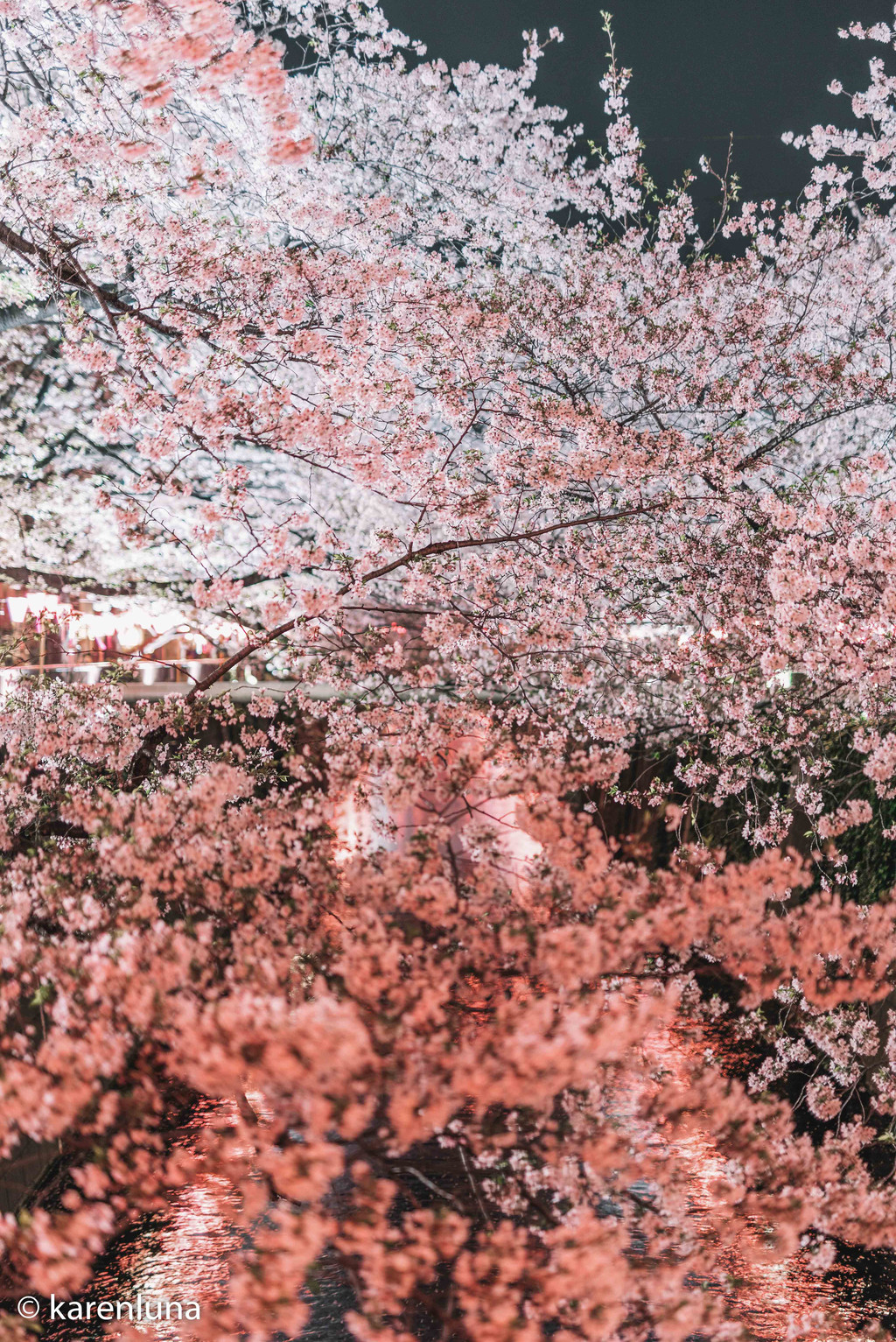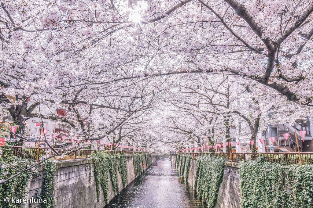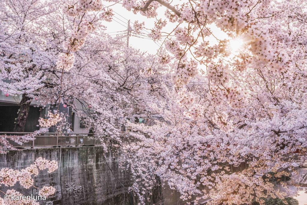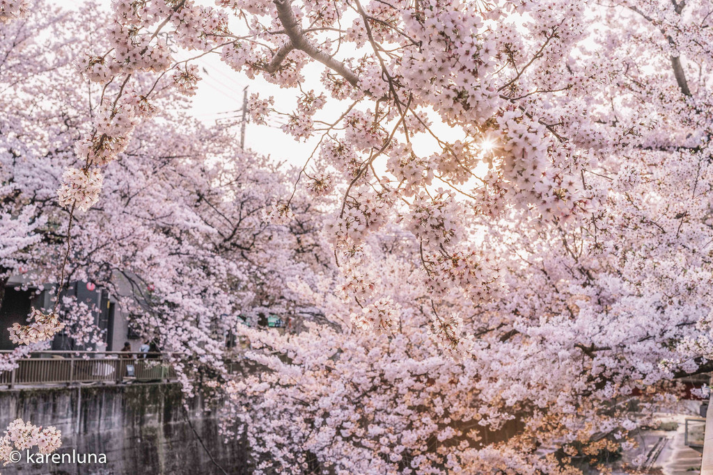 很多攻略都把目黑川放在东京赏樱胜地的榜首。果然是名不虚传!!!800+株樱花树沿着河道蜿蜒曲折,开满枝头的樱花延伸到河面上,偶有金色的阳光透着淡粉色的花瓣洒在面容上,那唯美的画面别提多梦幻了!而且不管白天还是夜晚,这里都是那么的妖娆绚烂。