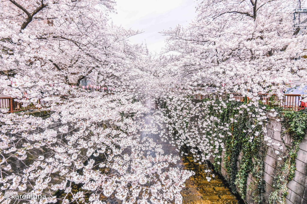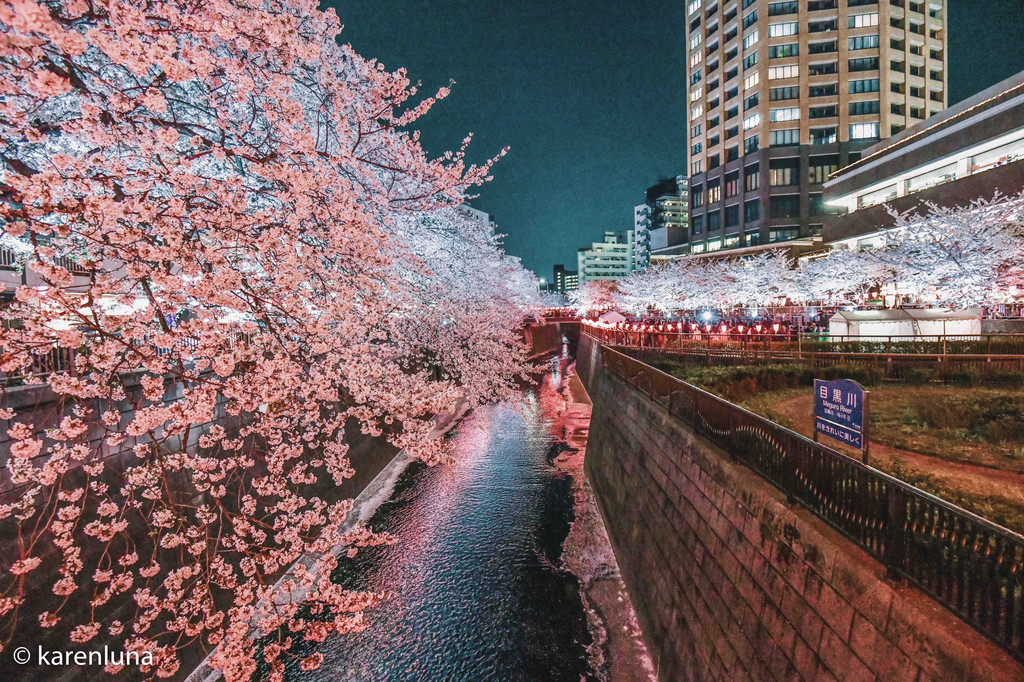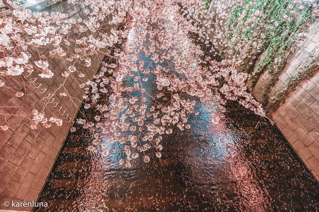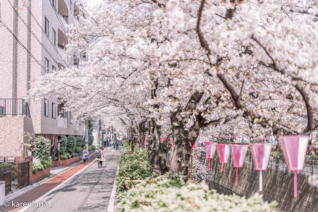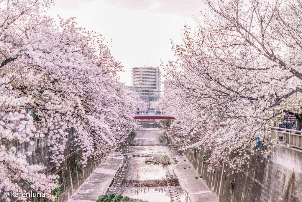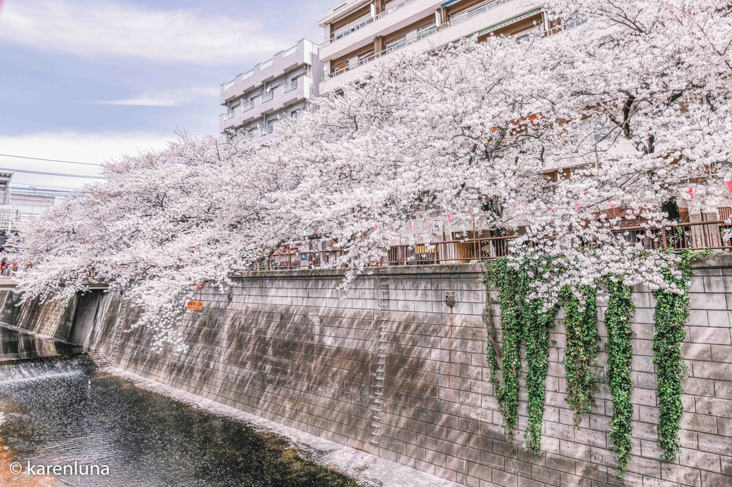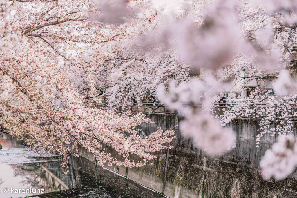 很多攻略都把目黑川放在东京赏樱胜地的榜首。果然是名不虚传!!!800+株樱花树沿着河道蜿蜒曲折,开满枝头的樱花延伸到河面上,偶有金色的阳光透着淡粉色的花瓣洒在面容上,那唯美的画面别提多梦幻了!而且不管白天还是夜晚,这里都是那么的妖娆绚烂。