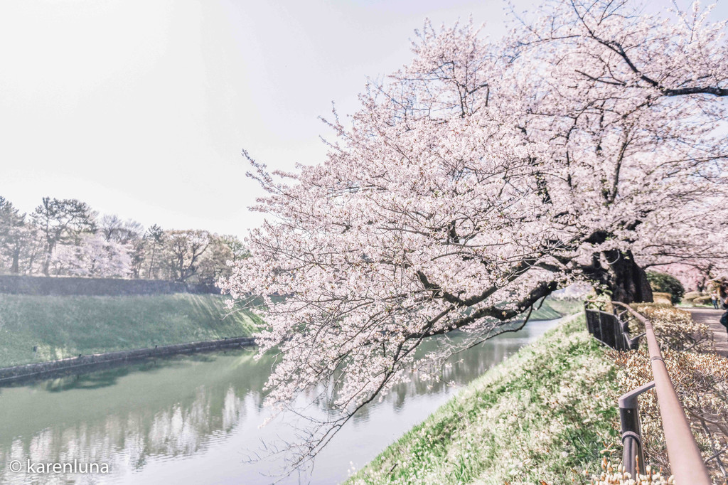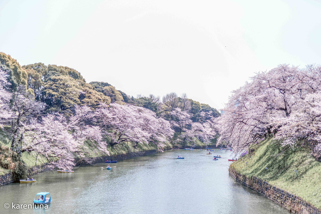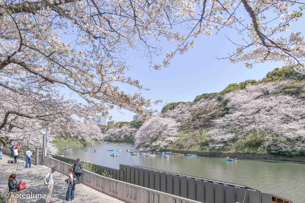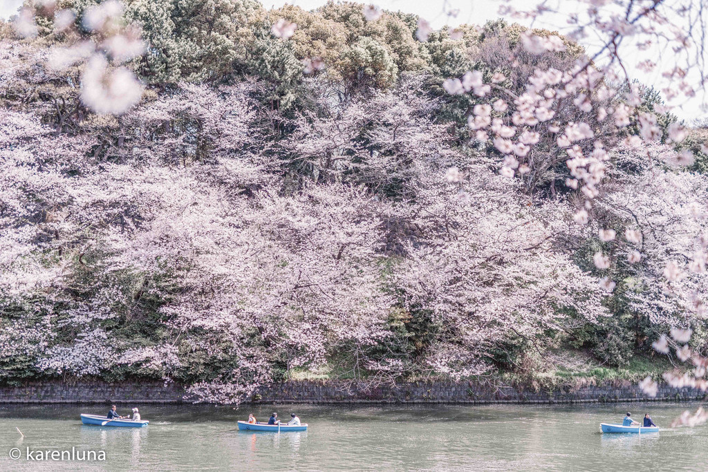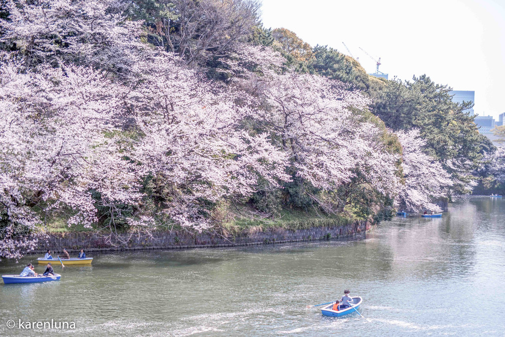 网上常说的千鸟之渊其实就是这条北之丸公园的河川。这里虽然樱花美爆,但我并不推荐,原因只有一个:游客超超超超级多。先不说河面上一条条小船有多密集,好不容易费尽体力得划到一处距离湖面很近的樱花枝下,拍照的时候却会发现背景里满是路人和小船,躲都躲不开。