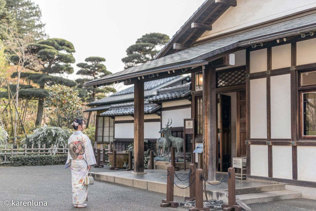 第一次知道江户 东京 建筑园还是因为在网上看到过一张人像写真,当时觉得超级美,便默默记下了拍摄地点,之后在搜索 东京 适合拍和服写真的旅拍地时又再次发现了这里。因距离市中心很远、公共交通又不能直达,所以出发前一度纠结到底要不要去。但当看到市区里的景点都是人山人海完全不能拍照的时候,便一咬牙一狠心,打车直奔了这里。