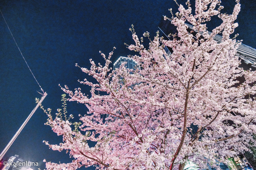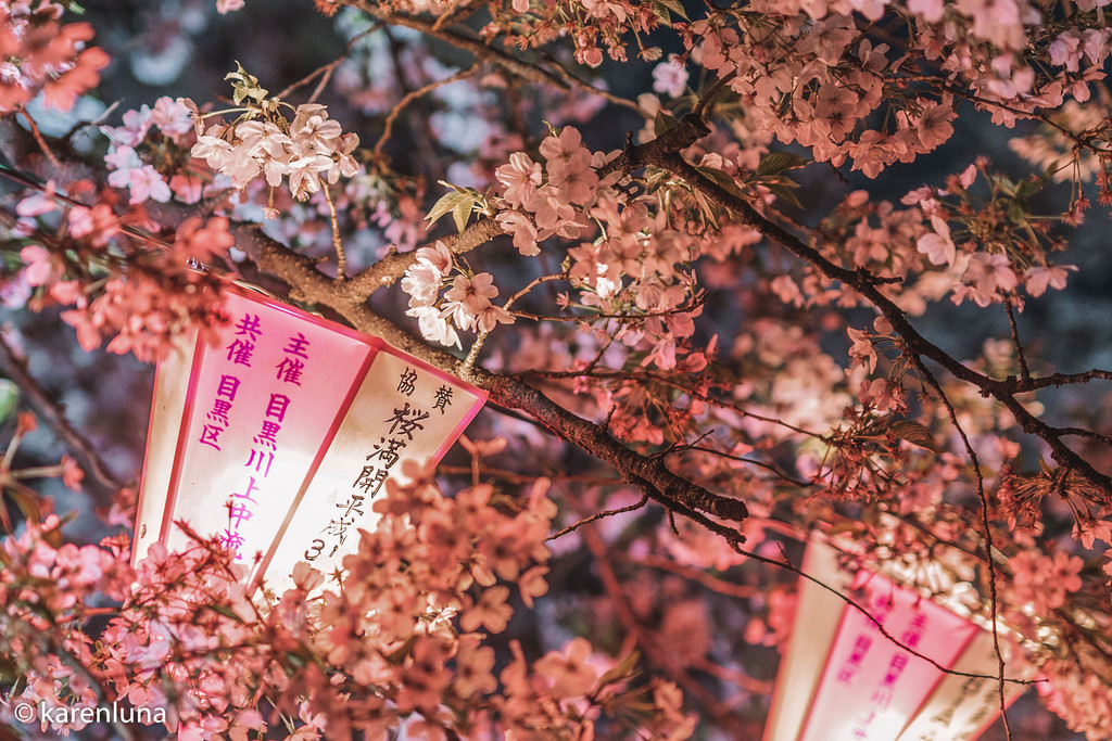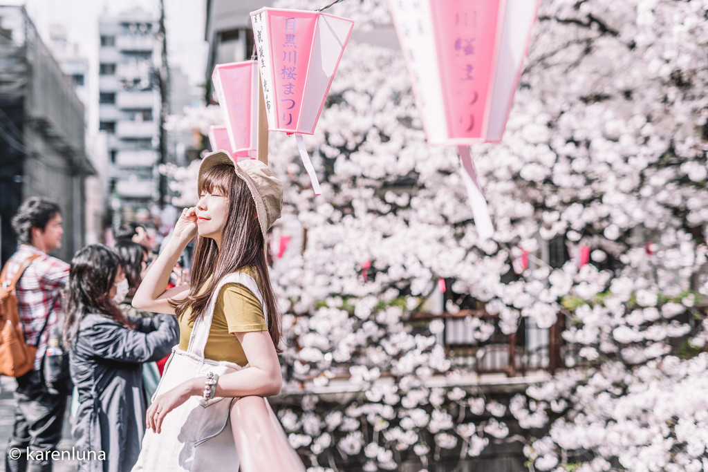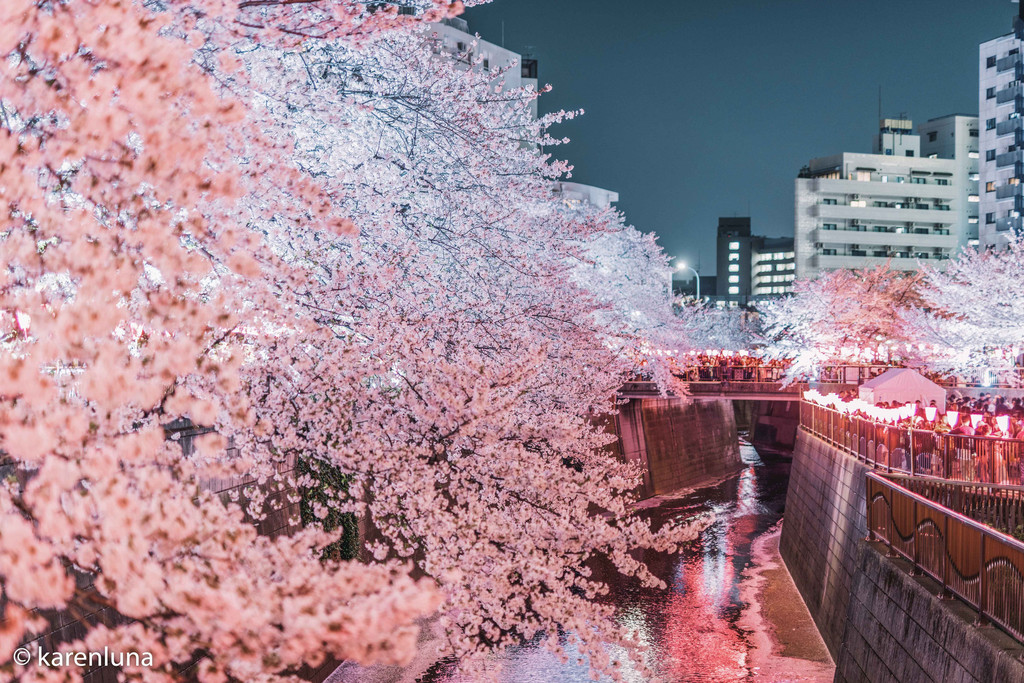 而夜晚的目黑川虽然被灯光照射得梦幻绚烂,但是游客多到真可以用“人山人海”来形容了。从出了地铁开始一直到目黑川的桥头,都只能跟着前面的人慢慢挪动,再加上路两边多了一排卖小吃的路边摊,真有种春节逛庙会的既视感。所以想要拍到夜樱人像,那就还是不要做梦了~~